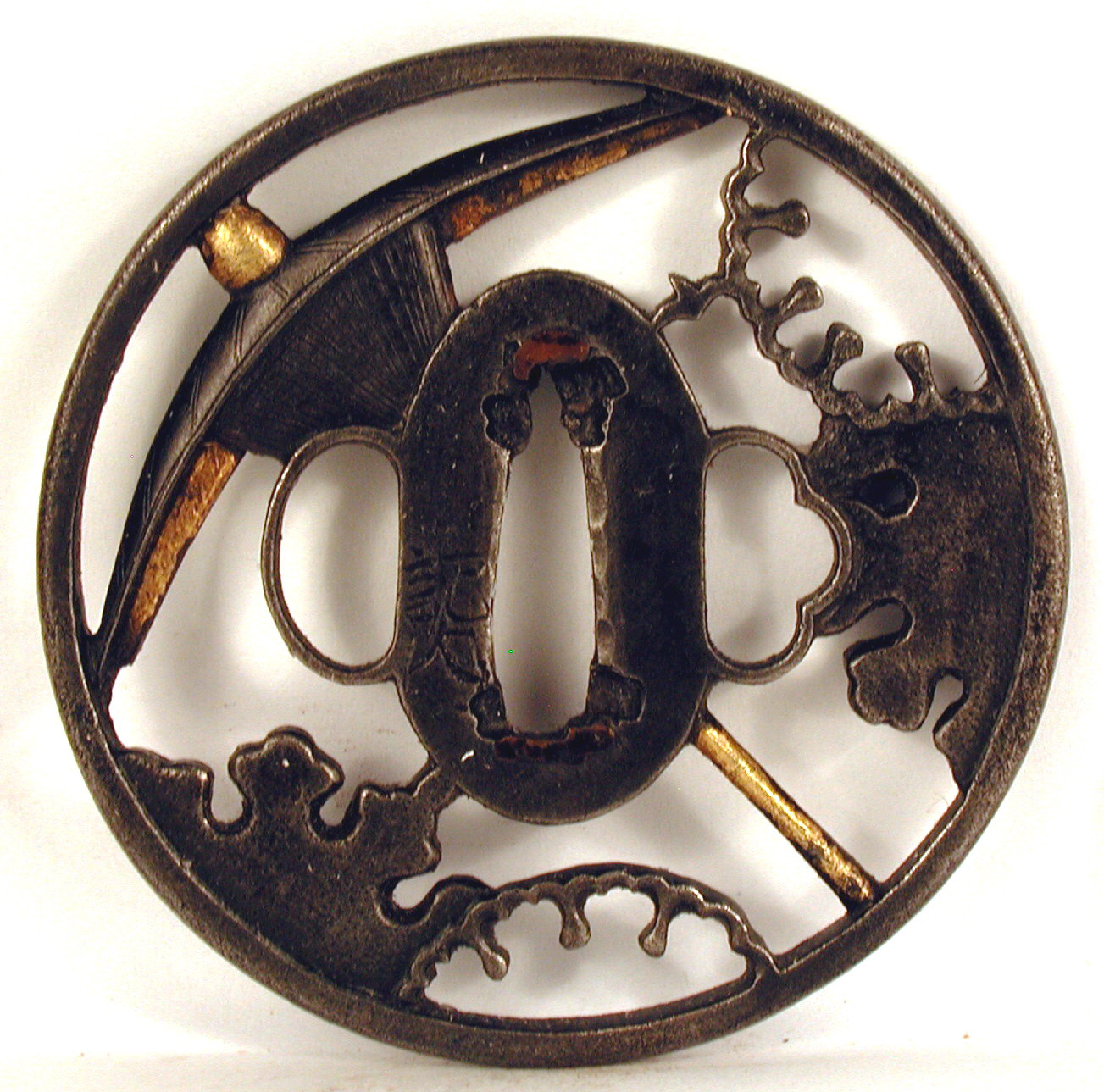 Закладка “Атрибуція” - Наим. предмета, издания: Цуба із зображенням парасольки і квіток півонії/Змiн. розміри: Д - 8,1см/Змiн.додаток до назва (лист, ...): Цуба залізна, круглої форми мару гата з вузьким пласким ободом з трьома отворами ріо хіцу з ажурним рельєфним орнаментом. Декор: у позитивному силуеті зображено парасольку та дві квітки півонії. Зображення модельовано з обох сторін./Змiн. час створення: Після 1781 р.Автор, автор съемки: Кінаі VНовый материал: дорогоцінні металиИзм. техника: гравіруваннямісце створення, школа: школа КінаїНовый материал: залізоИзм. техника: куванняИзм. техника: різьбленняИзм. техника: позолота