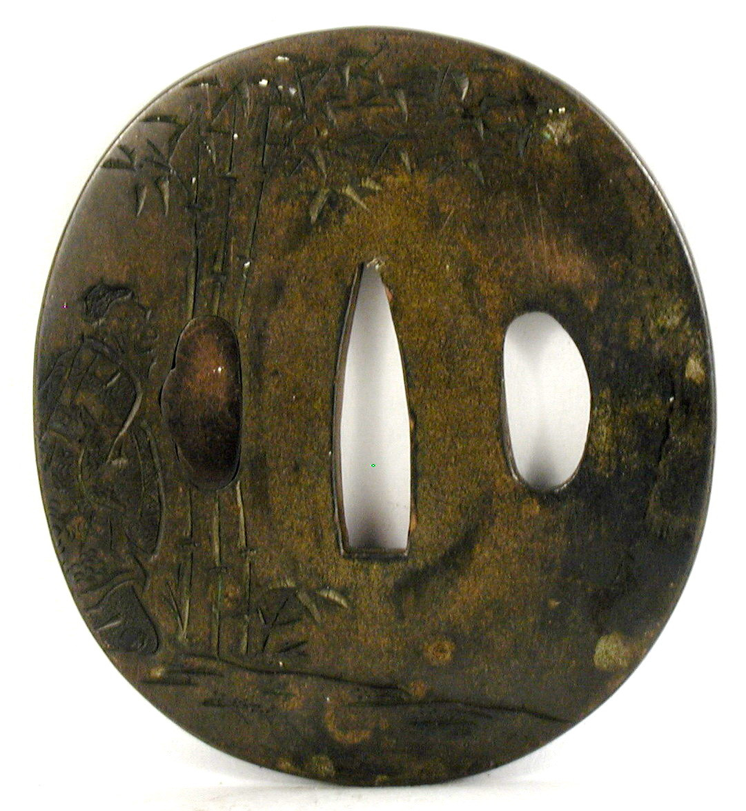 Історія Атрибуціi: 1. Консультація 1961 р. наукового співробітника Державного Ермітажу, канд. іст. наук В.Т. Дашкевич: Цуба з сібуїті. На полірованій поверхні гравіруванням ефукеборі (гравірування різної ширини та глибини, наслідуючи живопис тушшю) виконано зображення китайських мудреців у бамбуковому гаю. Обличчя та руки інкрустовано сріблом та червоною бронзою. Підпис: "Сомін" і какіхан (письмова печатка). Перша половина 18 ст./Кількість: 1/Опис: Уздовж центрального отвору граввіровано підпис "Сомін" і какіхан.