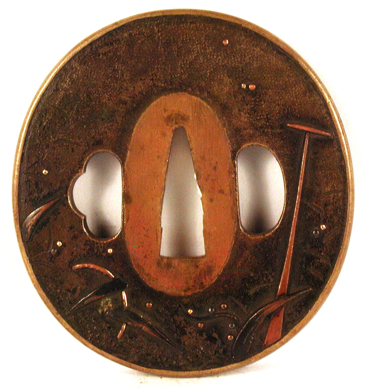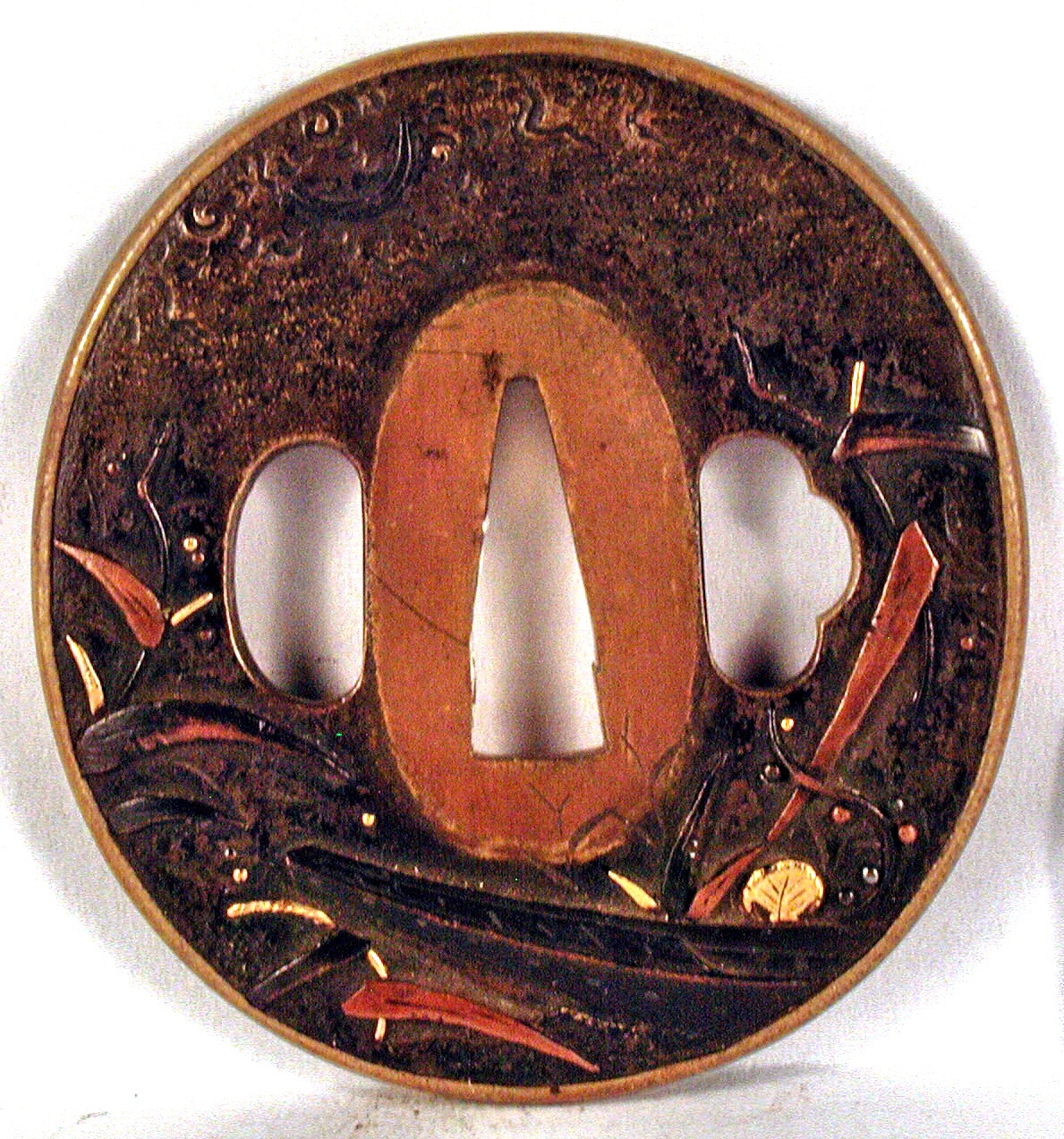 Закладка “Атрибуція” - Наим. предмета, издания: Цуба із зображенням човна у прибережних заростях/Змiн. розміри: 6,6 х 7,1 см/Змiн.додаток до назва (лист, ...): Цуба бронзова овальної форми (нага мару гата) з трьома отворами ріо хіцу ана наваго, когаі та кодзука ана), з тонким рельєфним позолоченим ободом мімі. На аверсі внизу зображено ніс човна серед заростей, праворуч – весло, угорі ліворуч – серп місяця. На реверсі – весло, прибережні трави./Змiн. час створення: XVII-XVIII ст.Автор, автор съемки: Невідомий майстермісце створення, школа: ЯпоніяИзм. техника: куванняИзм. техника: гравіруванняИзм. техника: інкрустація золотом та срібломИзм. техника: позолота