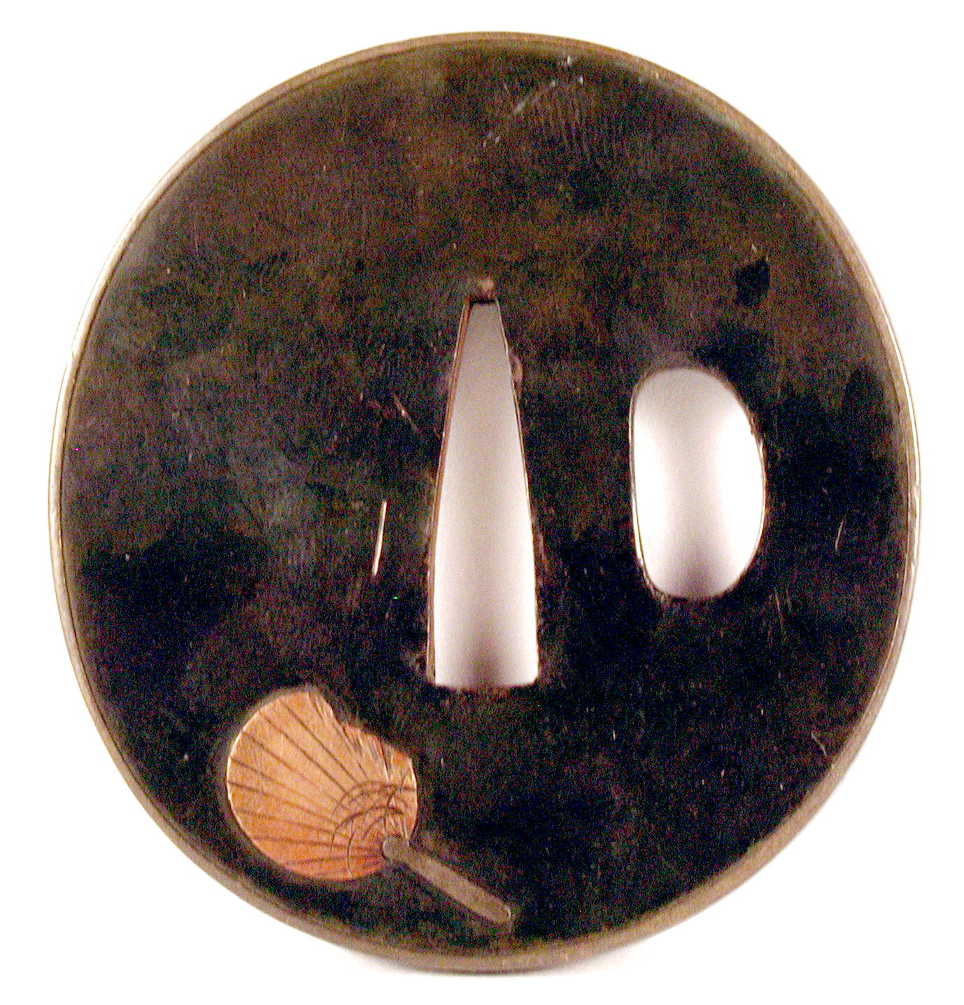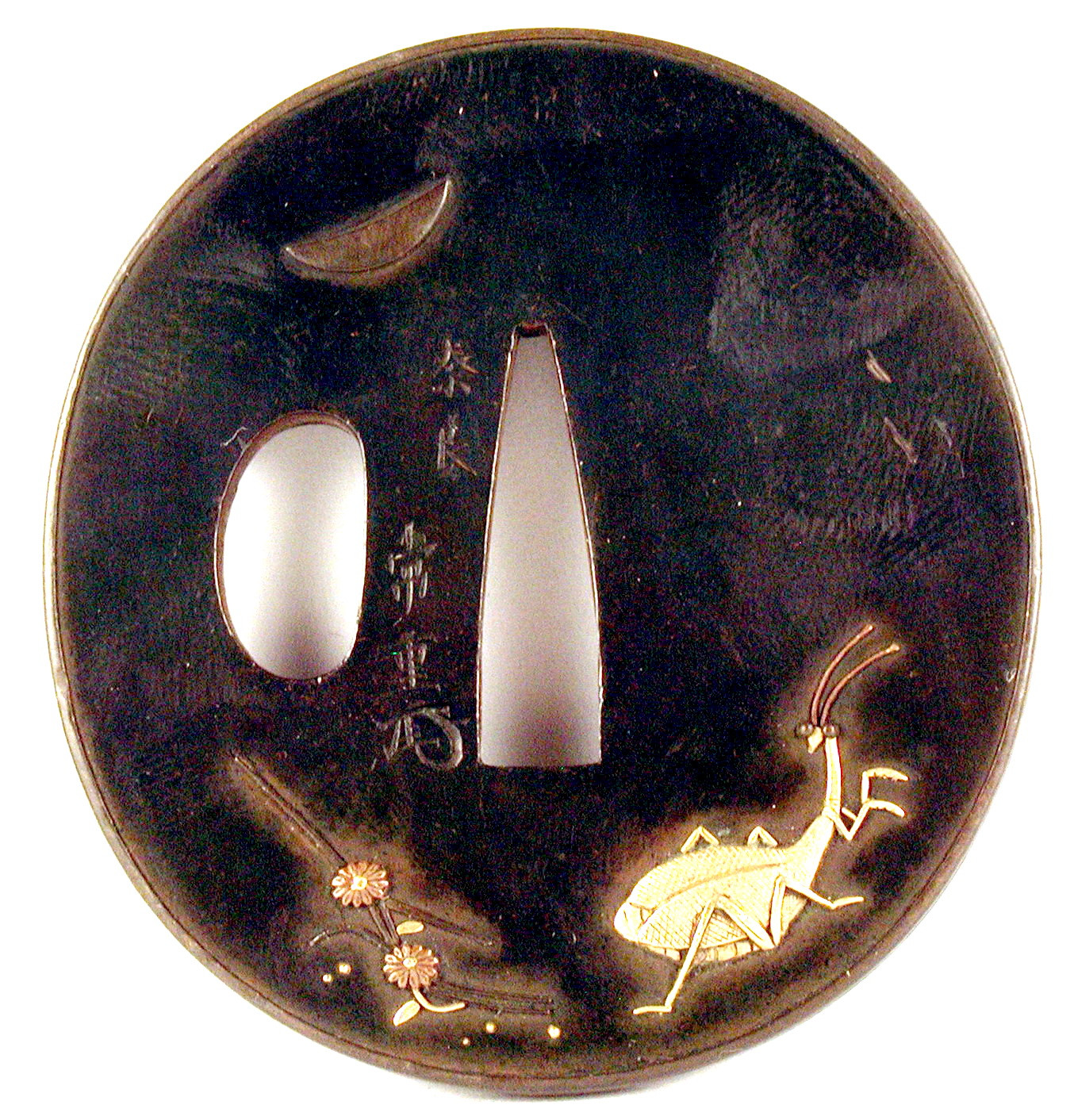 Закладка “Атрибуція” - Наим. предмета, издания: Цуба із зображенням богомола, місяця і хризантем./Змiн. розміри: 6,3 х 6,8 см/Змiн.додаток до назва (лист, ...): Цуба з сякудо овальної форми naga-maru-gata з накладним ободом (mimi) з сібуіті. Має два отвори: накаго та кодзука-хіцу-ана. На аверсі внизу зображено богомола і квітучу гілку хризантеми, над ними ліворуч – півмісяць. На реверсі: унизу – зображення віяла./Змiн. Написи, клейма, марки: На аверсі на сеппа-даі ліворуч від центрального отвору підпис майстра Nara Tsuneshige і іменна печатка (какіхан): Kawamura Ichiemon./Змiн. час створення: Середина 18 ст.Автор, автор съемки: Нара Цунесігемісце створення, школа: школа НараНовый материал: сплав сякудоНовый материал: сплав сібуітіНовый материал: бронзаИзм. техника: литтяИзм. техника: гравіруванняИзм. техника: накладний рельєфИзм. техника: інкрустація