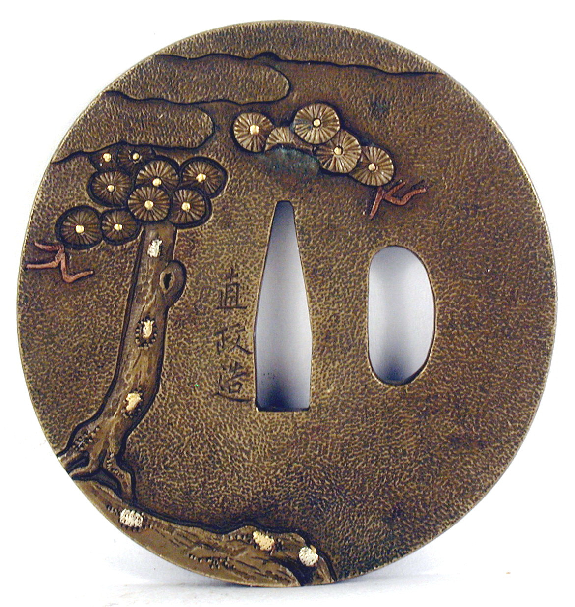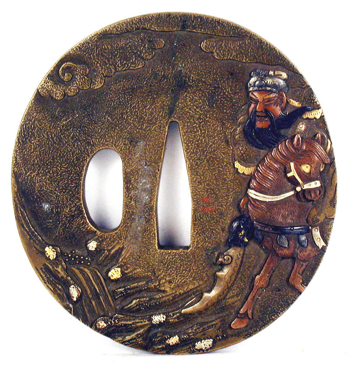 Авторські підписи, клейма: Уздовж центрального отвору гравіровано підпис: "Наомаса, родина Янагава"./Історія Атрибуціi: 1. Консультація 1961 р. наукового співробітника Державного Ермітажу, канд. іст. наук В.Т. Дашкевич: цуба з жовтої бронзи сентоку. На тлі, гравіровання якого імітує шкіру, зображено китайського героя-воїна Каню на коні з алебардою у правій руці.Зображення виконано сполученням гравірування, заглибленого рельєфа та горельєфної інкрустації червоною бронзою, сякудо, сібуїті та золотом. Підпис: Наомаса. Родина Янагава. Середина 18 ст./Кількість: 1