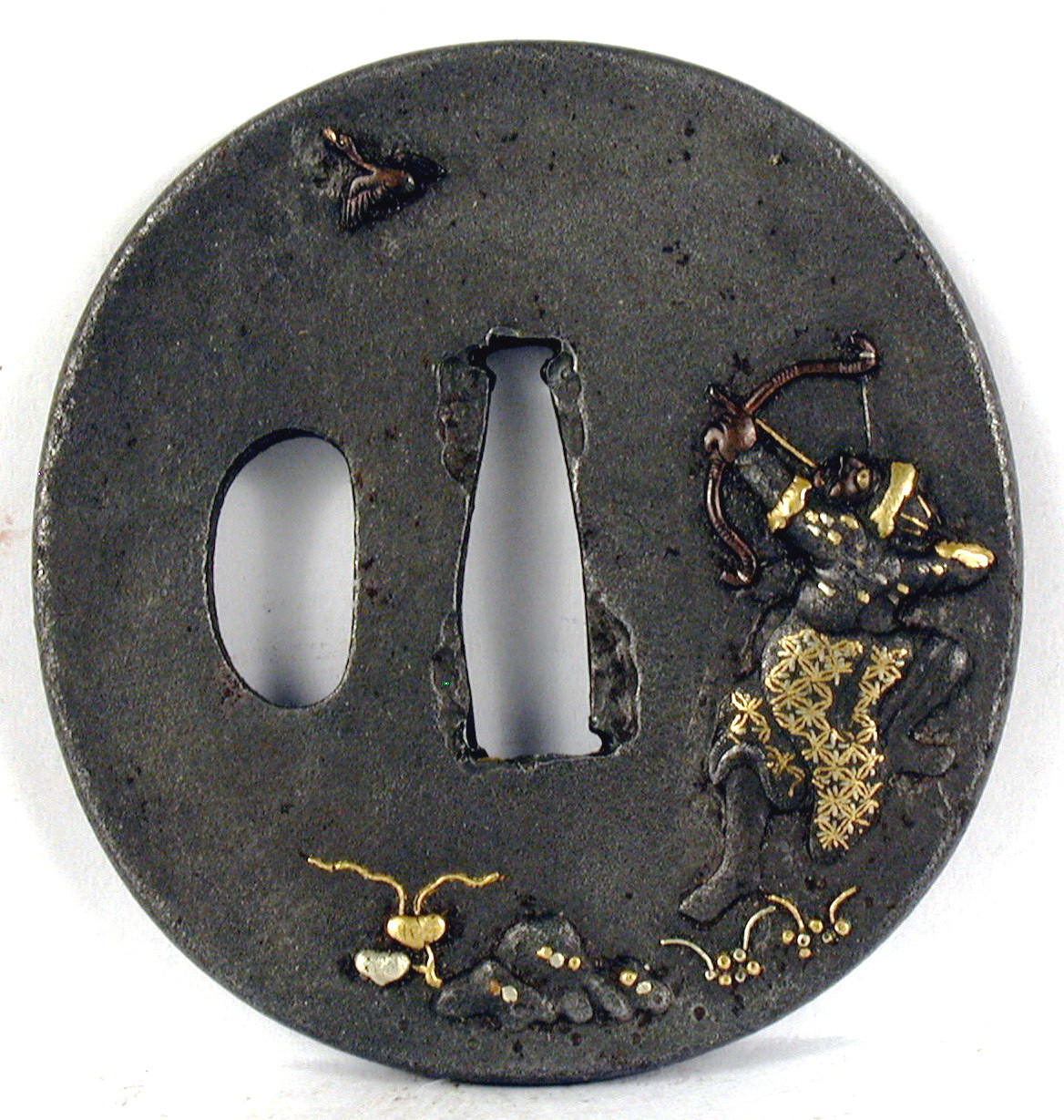 Закладка “Атрибуція” - Наим. предмета, издания: Цуба із зображенням сюжету «монгольське полювання»/Змiн. розміри: 6,6 х 7,0 см/Змiн. час створення: 18 ст.Автор, автор съемки: Невідомий майстерИзм. техника: куванняИзм. техника: гравіруванняИзм. техника: накладний рельєфИзм. техника: інкрустація золотомИзм. техника: позолота
