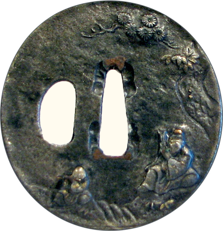 Закладка “Атрибуція” - Наим. предмета, издания: Цуба із зображенням сенніна, який спостерігає за грою учня на флейті/Змiн. розміри: 5,8 х 6,2 см/Змiн. час створення: XVIII ст.Автор, автор съемки: Невідомий майстерИзм. техника: куванняИзм. техника: гравіруванняИзм. техника: накладний рельєфИзм. техника: інкрустаціяИзм. техника: позолотаИзм. техника: сріблення