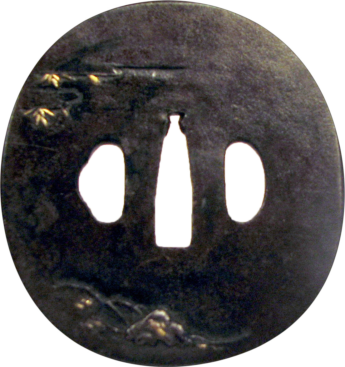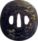 Закладка “Атрибуція” - Наим. предмета, издания: Цуба із зображенням «китайських мудреців у бамбуковому гаю»/Змiн. розміри: 7,5 х 8,1 х 8,2 см/Змiн.додаток до назва (лист, ...): Цуба залізна овальної форми (naga maru gata) з трьома отворами (rio hitsu), з тонким рельєфним ободом (mimi). На аверсі зображено 3-х чоловік і високі зарості бамбука. На реверсі – внизу зображено камінці і трави, зверху – листя бамбука./Змiн. час створення: 17 ст.Автор, автор съемки: Невідомий майстермісце створення, школа: школа НараИзм. техника: куванняИзм. техника: гравіруванняИзм. техника: інкрустаціяНовый материал: залізоНовый материал: бронза