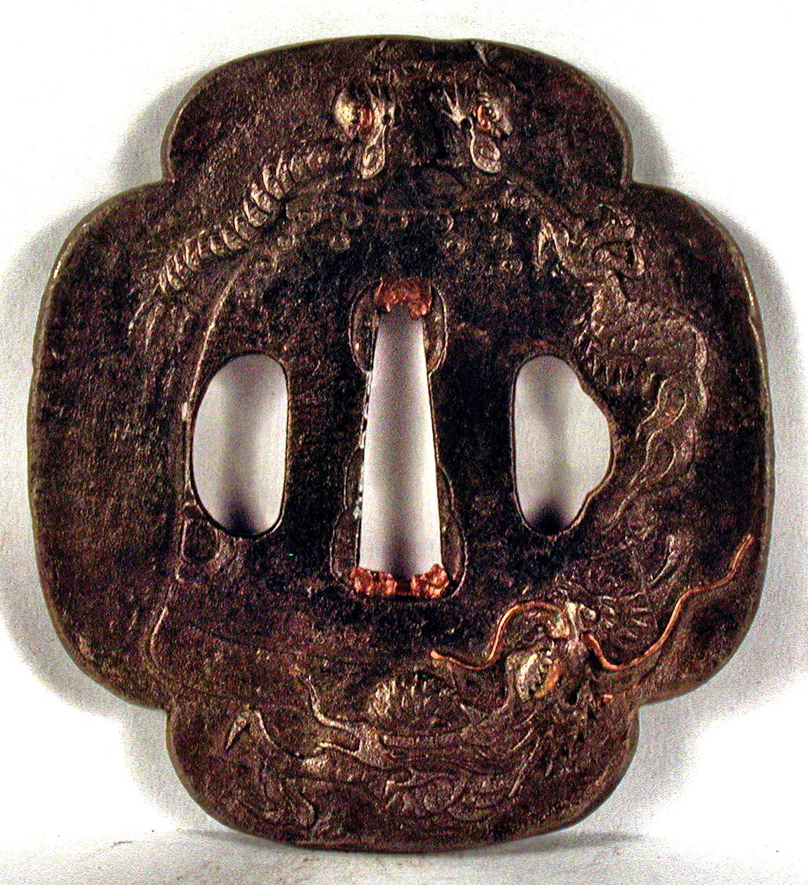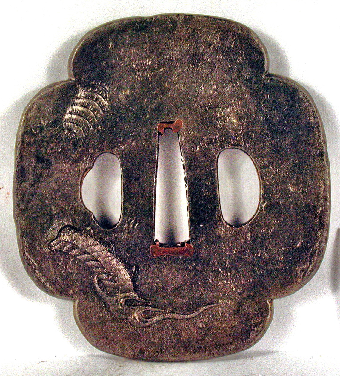 Закладка “Атрибуція” - Наим. предмета, издания: Цуба із зображенням дракона/Змiн. розміри: 7,1 х 7,8 х 8,0 см/Змiн. час створення: XVIII-XIX ст.Автор, автор съемки: Невідомий майстерНовый материал: залізоНовый материал: бронзаИзм. техника: куванняИзм. техника: гравіруванняИзм. техника: інкрустація бронзою