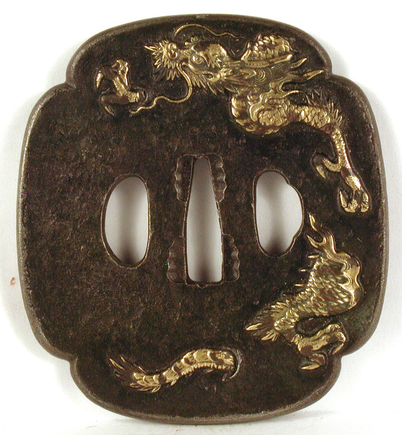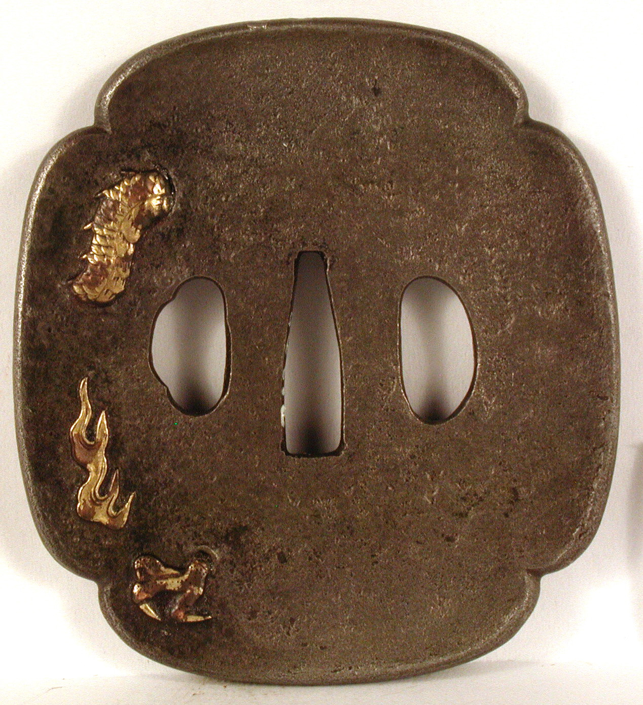 Закладка “Атрибуція” - Наим. предмета, издания: Цуба із зображенням дракона/Змiн. розміри: 7,6 х 8,4 х 8,7 см/Змiн. час створення: 18-19 ст.Автор, автор съемки: Невідомий майстерИзм. техника: куванняИзм. техника: гравіруванняИзм. техника: накладний рельєфИзм. техника: позолота