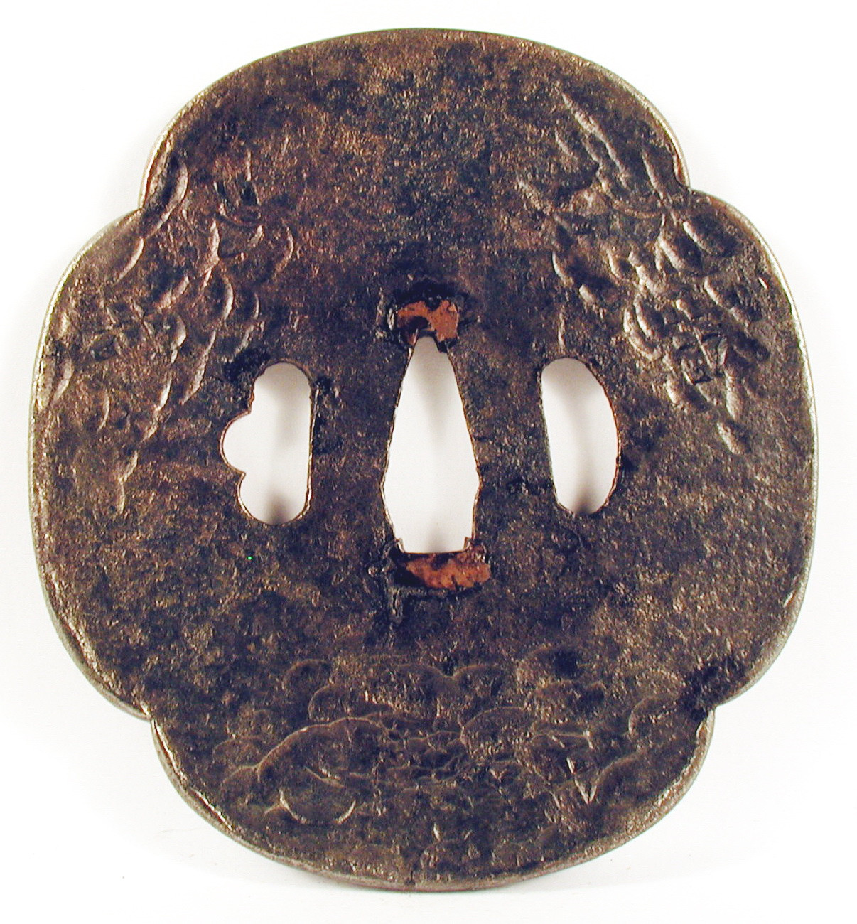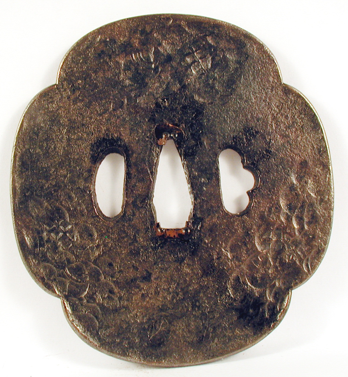 Закладка “Атрибуція” - Наим. предмета, издания: Цуба із тисненим візерунком (?)/Змiн. розміри: 9,4 х 10,3 см/Змiн. час створення: XVI-XVII ст.місце створення, школа: школа СьоаміИзм. техника: кування