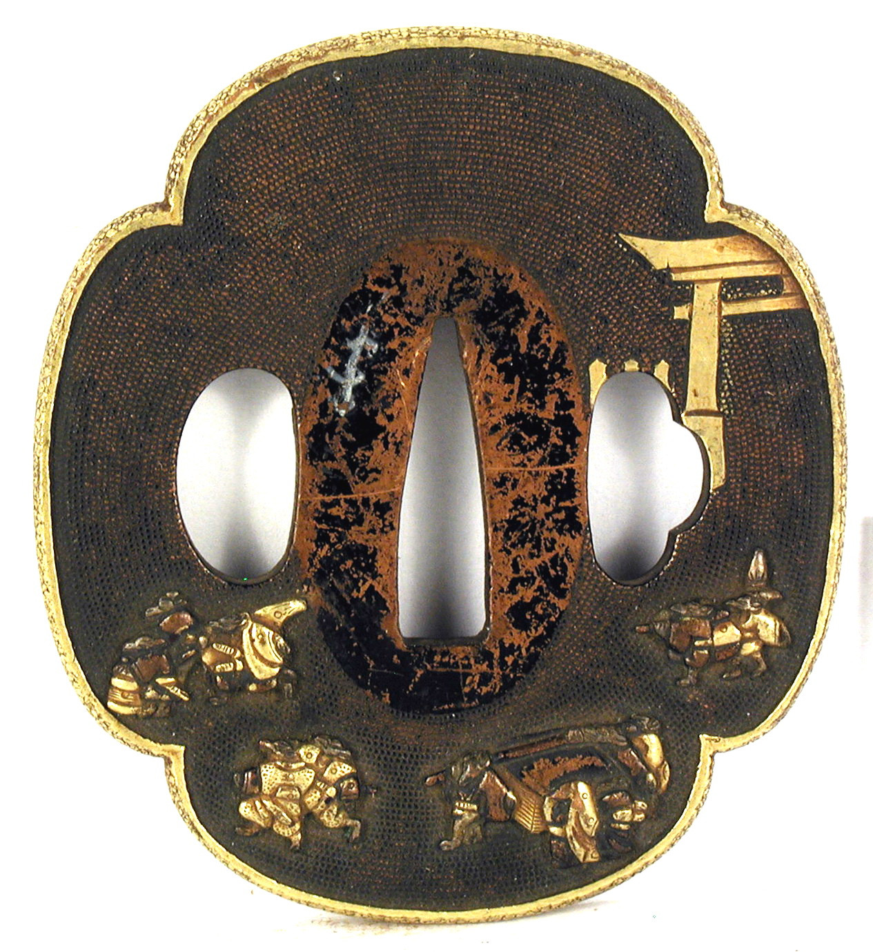 Закладка “Атрибуція” - Наим. предмета, издания: Цуба із зображенням міфічних персонажів (?)/Змiн. розміри: 6,1 х 6,8 см/Змiн. час створення: XIX ст.Автор, автор съемки: Невідомий майстерНовый материал: бронзаИзм. техника: куванняИзм. техника: гравіруванняИзм. техника: накладний рельєфИзм. техника: позолота