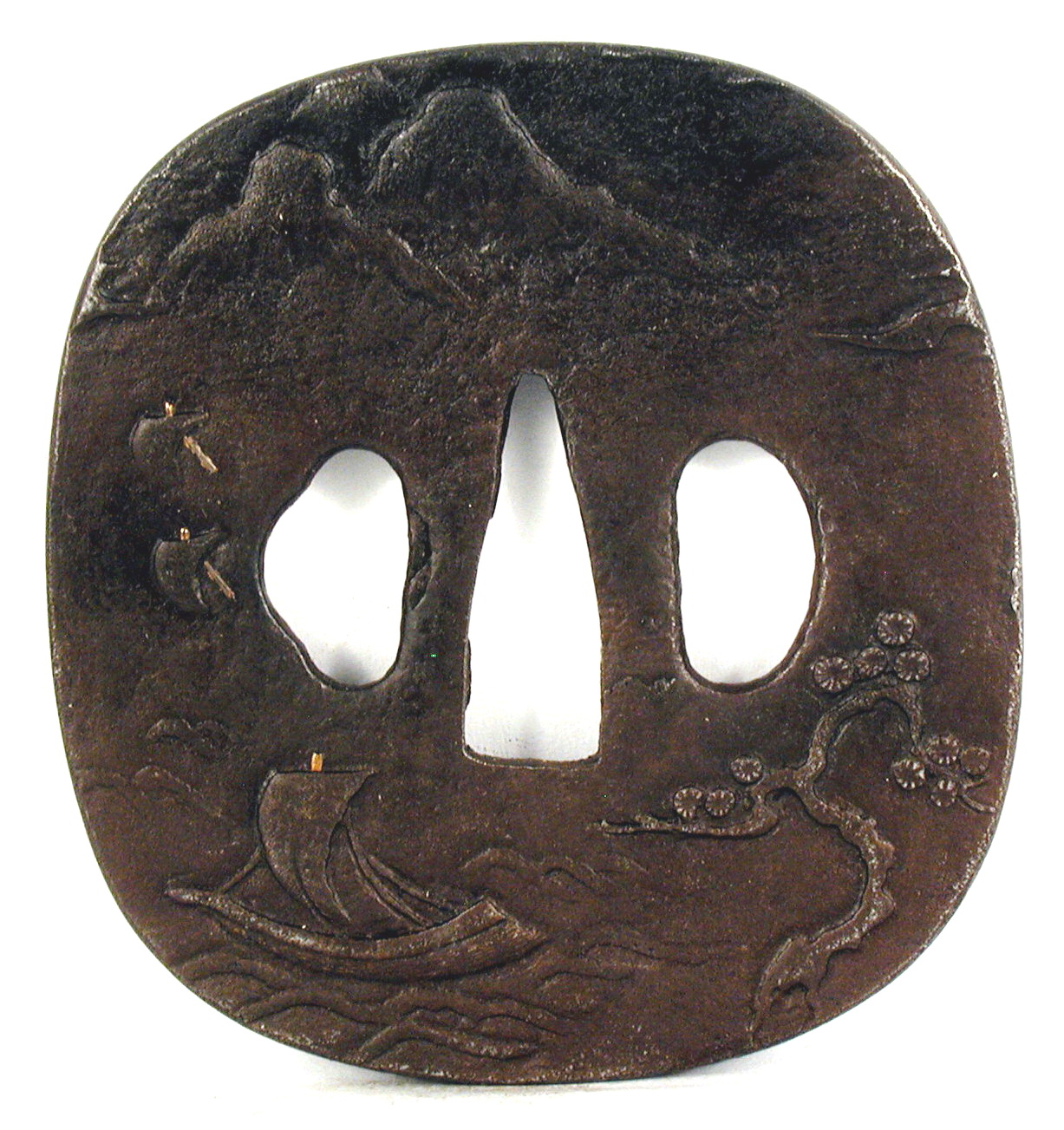 Закладка “Атрибуція” - Наим. предмета, издания: Цуба із зображенням краєвиду з будинком на скелі та чоловіка у вікні/Змiн. розміри: 7,5 х 8,5 см/Змiн.додаток до назва (лист, ...): Цуба залізна, близької до овалу форми аорі гата з трьома отворами ріо хіцу ана, з тонким пласким ободом мімі. На аверсі зображено водоспад, сосни на березі, праворуч – чоловіка і вікні. На реверсі – гори, сосна і три парусні човни серед хвиль./Змiн. час створення: 18 - перша половина 19 ст.Автор, автор съемки: Майстер школи Дзякушімісце створення, школа: ЯпоніяИзм. техника: куванняИзм. техника: гравіруванняИзм. техника: інкрустаціяИзм. техника: патинуванняИзм. техника: позолотаНовый материал: залізоНовый материал: мідний сплав