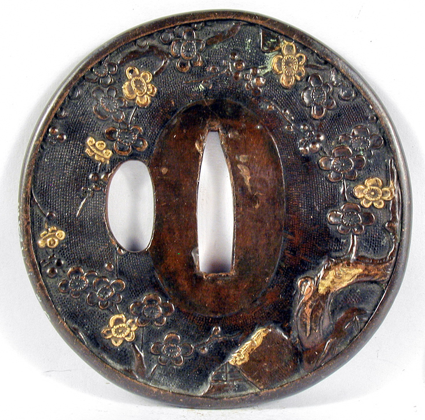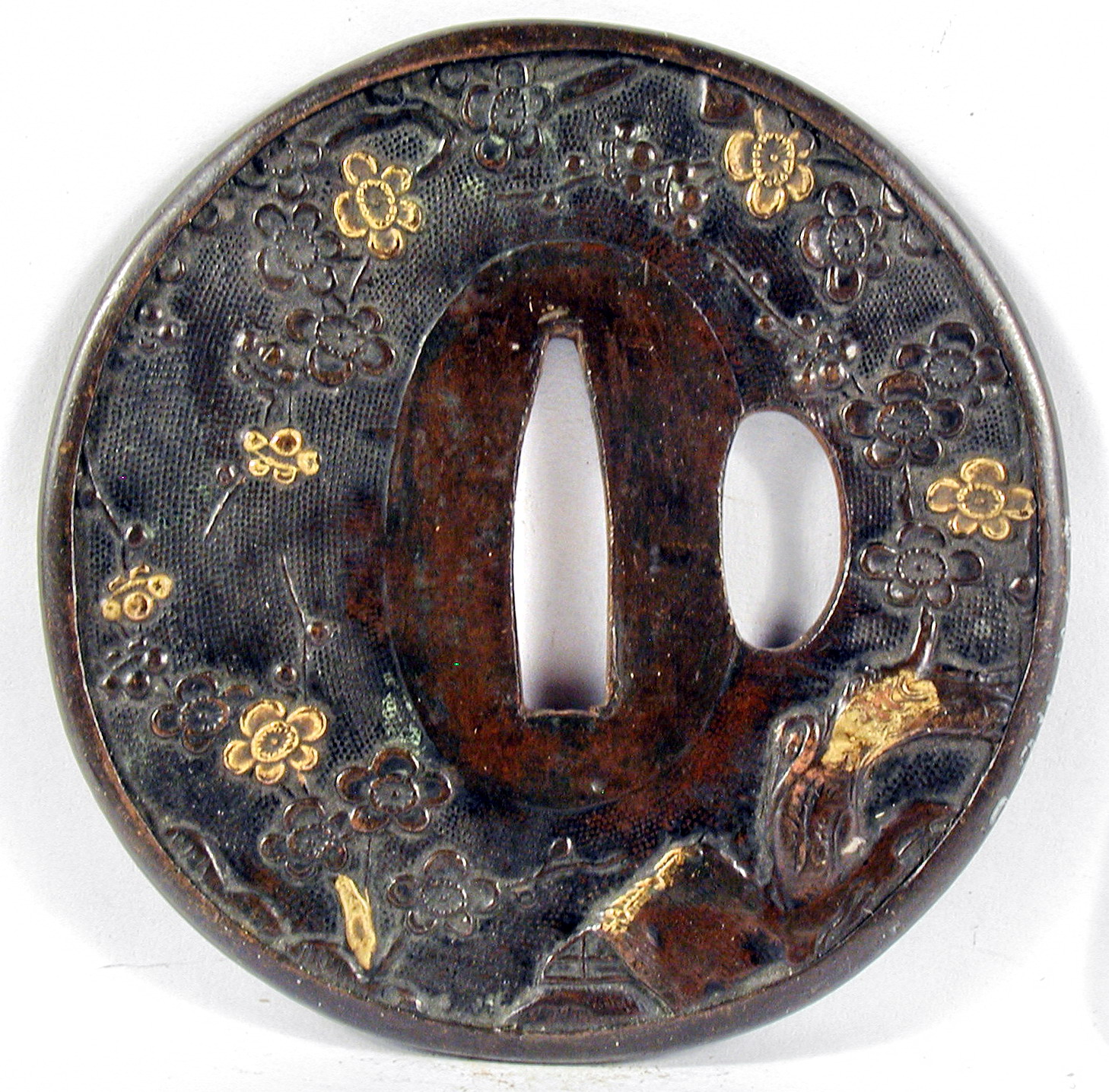 Закладка “Атрибуція” - Наим. предмета, издания: Цуба із зображенням квітучої сливи/Змiн. розміри: 7,3 х 7,4 см/Змiн. час створення: XIX ст.Автор, автор съемки: Невідомий майстерНовый материал: бронзаИзм. техника: куванняИзм. техника: гравіруванняИзм. техника: патинуванняИзм. техника: позолота