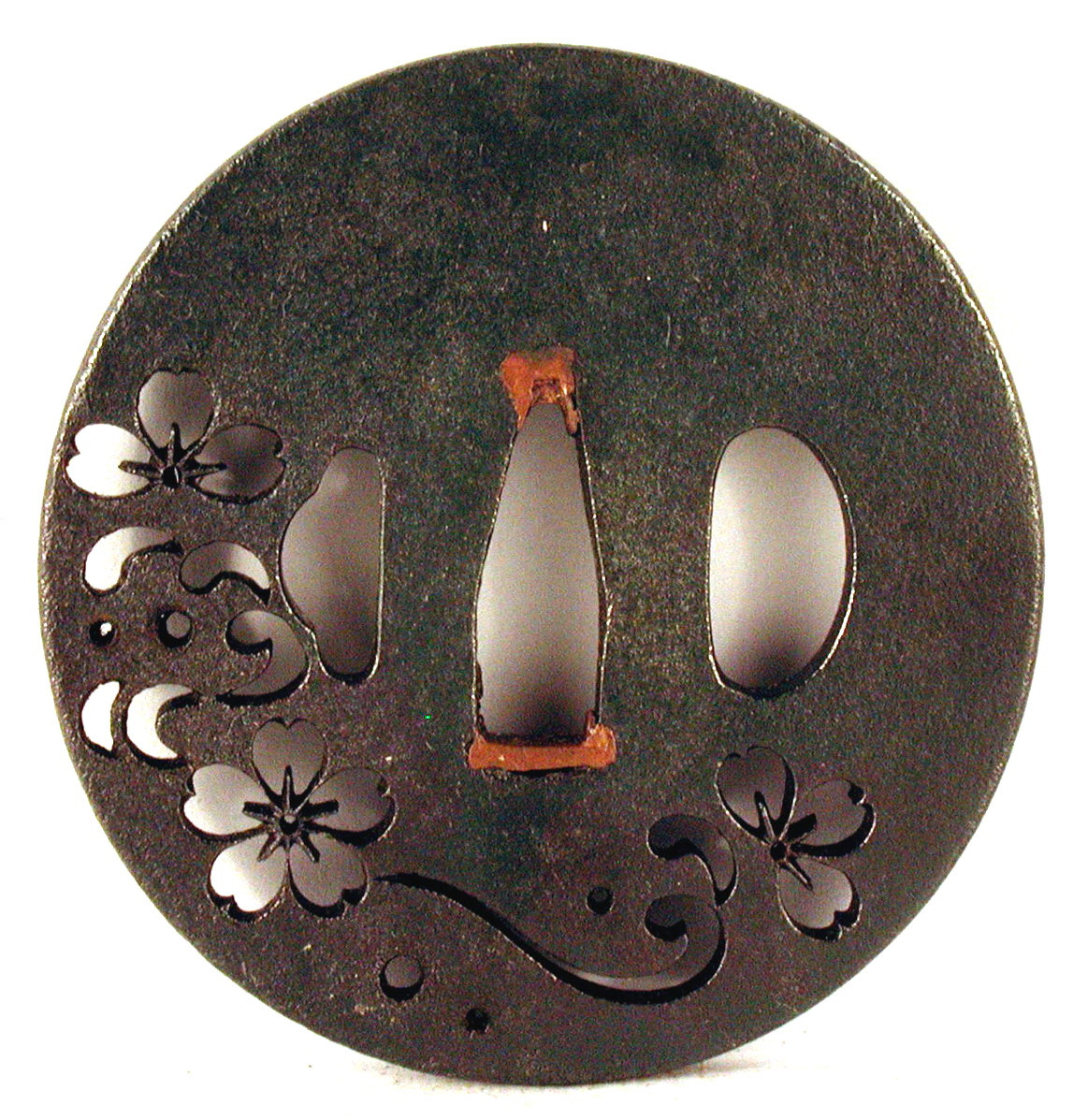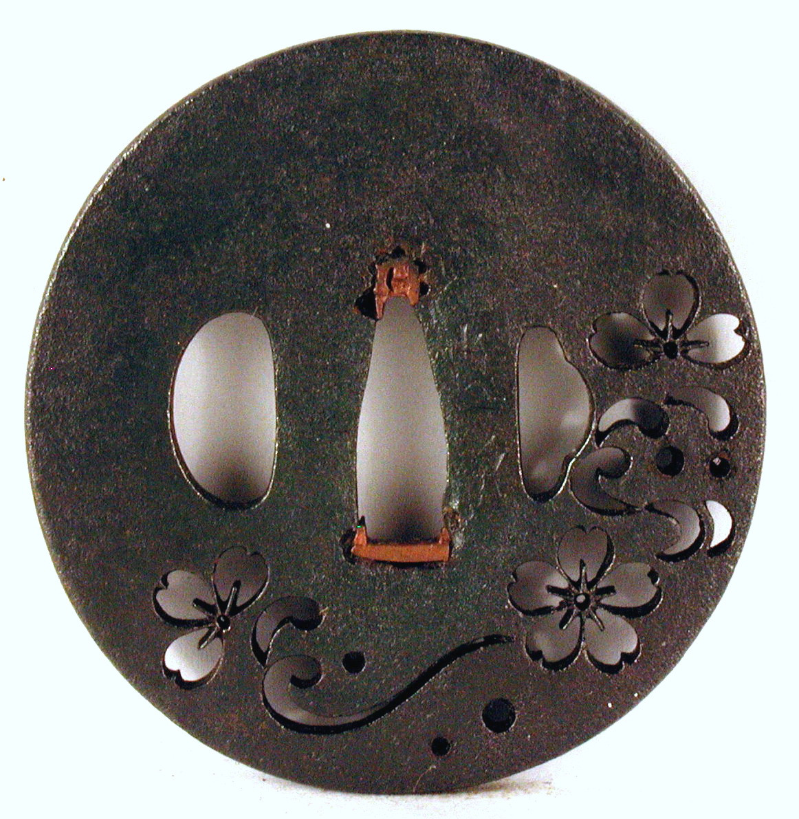 Закладка “Атрибуція” - Наим. предмета, издания: Цуба із зображенням квіток сакури/Змiн. розміри: 6,8 х 7,1 см/Змiн.додаток до назва (лист, ...): Цуба залізна, овальної форми нага мару гата з трьома отворами ріо хіцу ана (накаго-, когаї- та кодзука хіцу ана). Обід відсутній Оздоблена наскрізним різьбленням В негативному силуеті зображено квітку сакури, пелюстки і дві напівквітки сакури, також краплі роси./Змiн. Написи, клейма, марки: На аверсі праворуч від накаго ана гравіровано підпис: «Tadatsugu»./Змiн. час створення: Кінець 17 ст.Автор, автор съемки: Сьоамі Тадацугумісце створення, школа: м. КіотоИзм. техника: куванняИзм. техника: різьбленняИзм. техника: гравірування