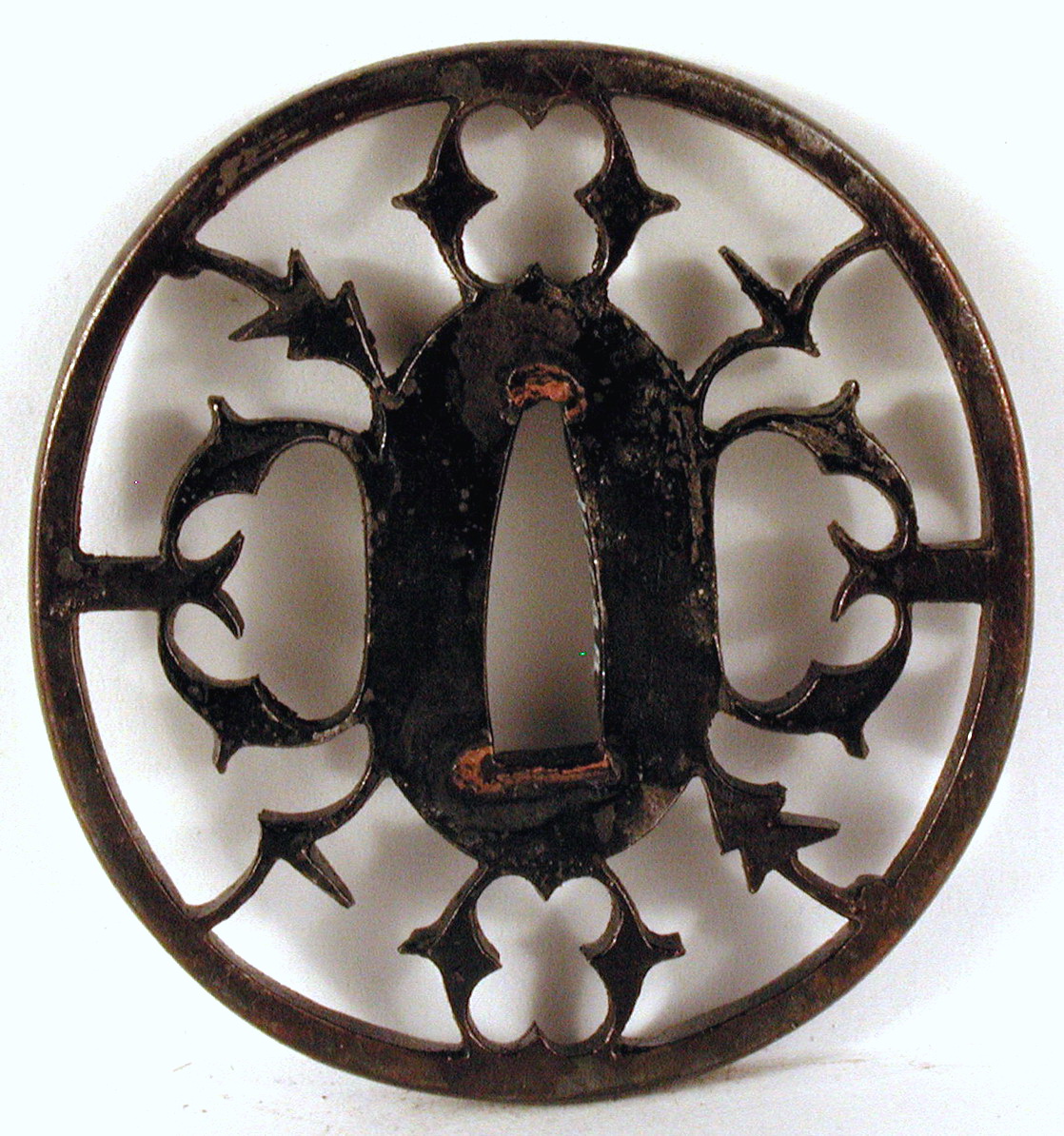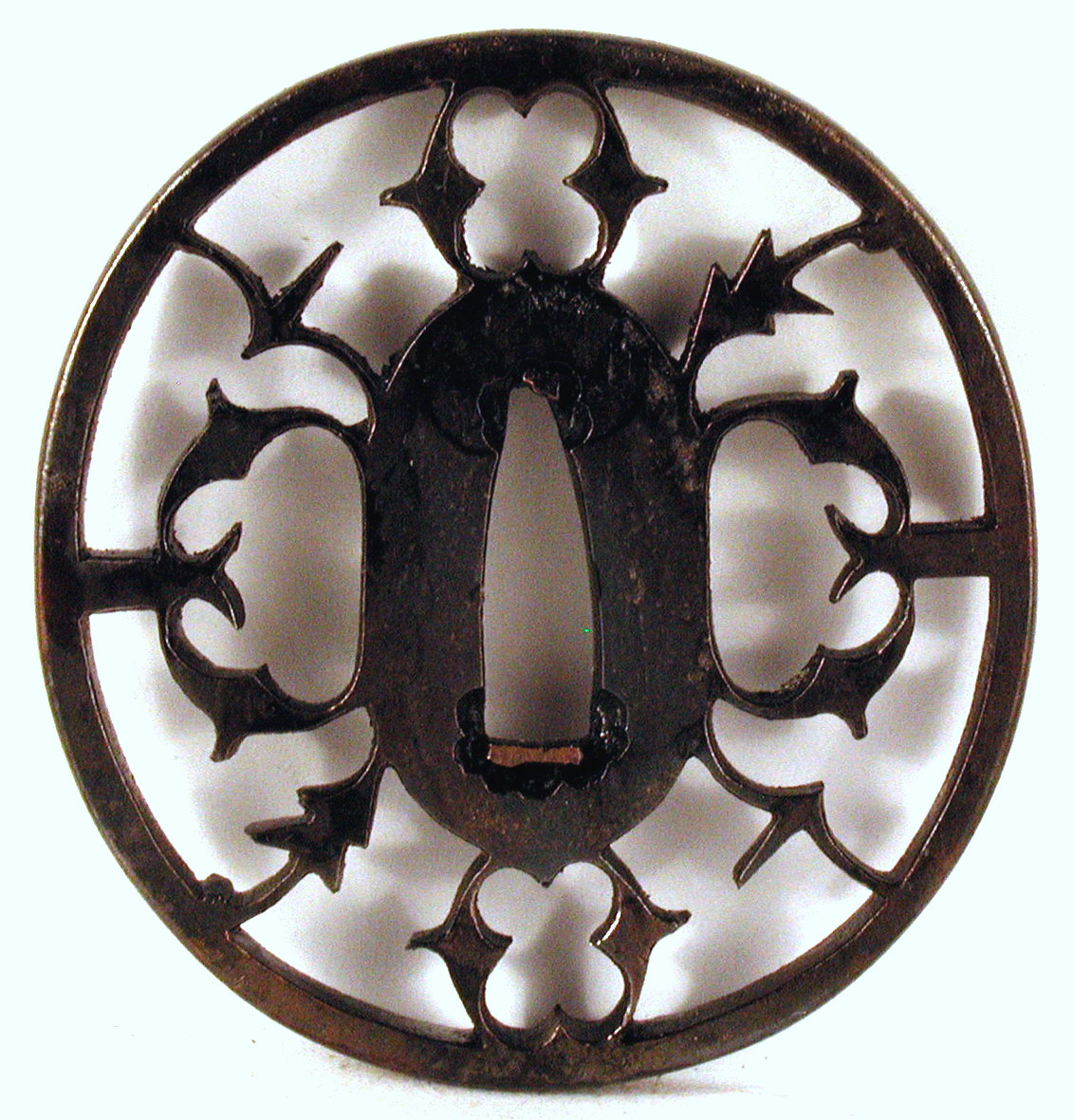 Закладка “Атрибуція” - Змiн. розміри: 6,7 х 7,1 см/Змiн.додаток до назва (лист, ...): Цуба із зображенням стилізованих птахів/Змiн. час створення: XV-XVI ст. (?)Автор, автор съемки: Невідомий майстермісце створення, школа: провінція ОваріИзм. техника: куванняИзм. техника: гравірування