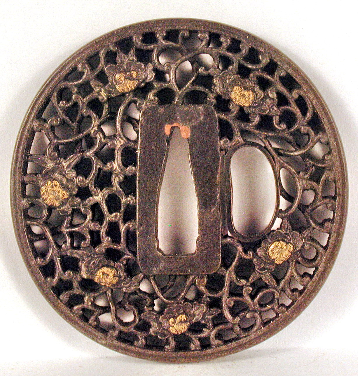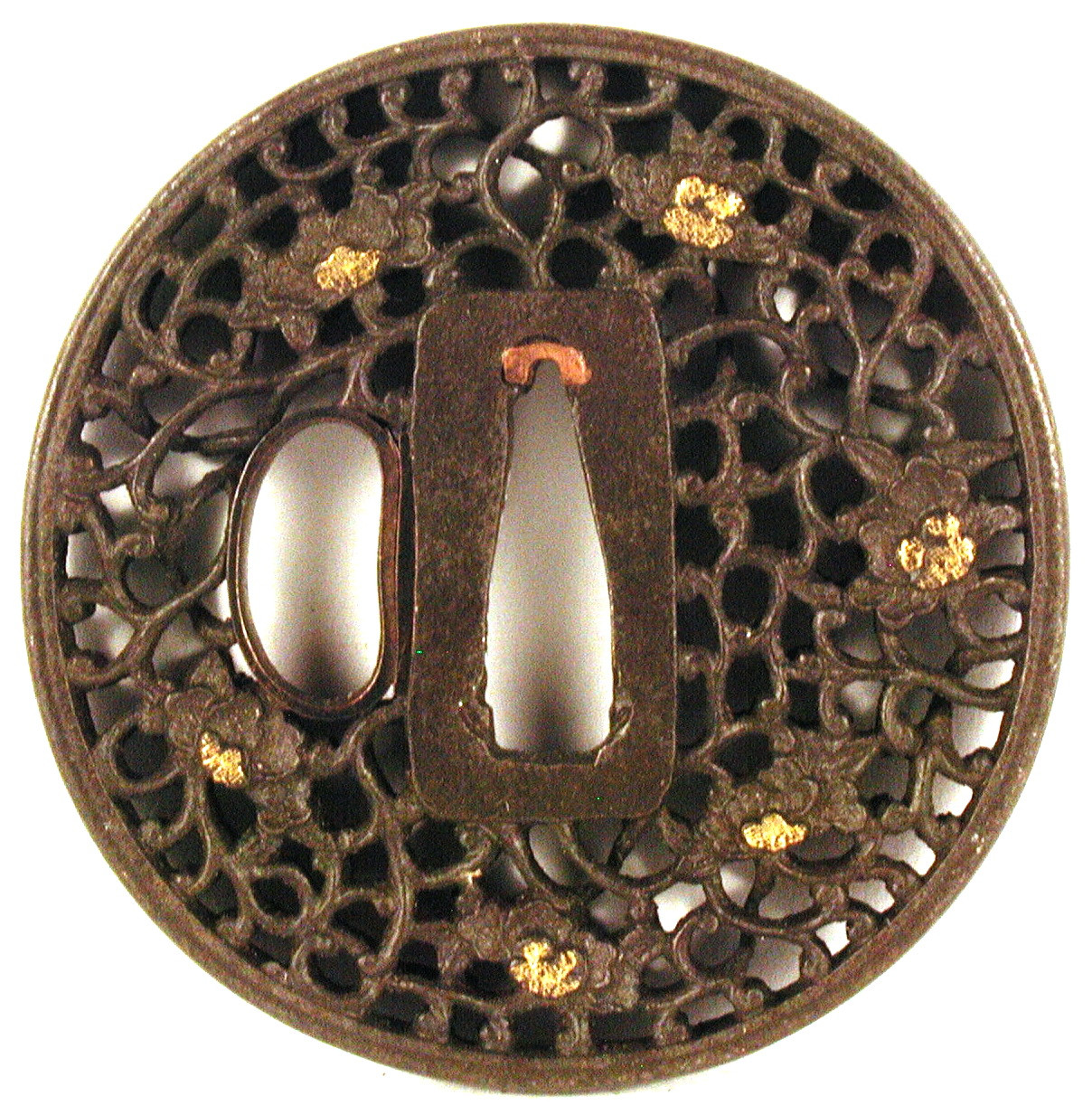 Закладка “Атрибуція” - Наим. предмета, издания: Цуба у стилі "намбан" зі стилізованими квітами/Змiн. розміри: 6,9 х 7,0 х 7,1 см/Змiн. час створення: 17 - 18 ст.Автор, автор съемки: Невідомий майстермісце створення, школа: стиль НамбанИзм. техника: куванняИзм. техника: різьбленняИзм. техника: патинуванняИзм. техника: насічка золотом