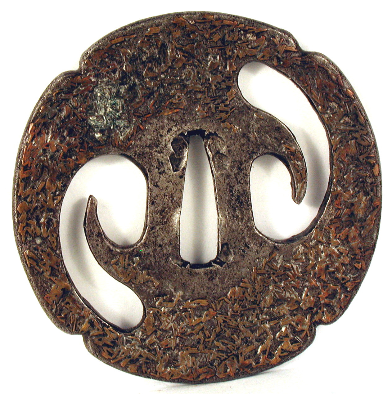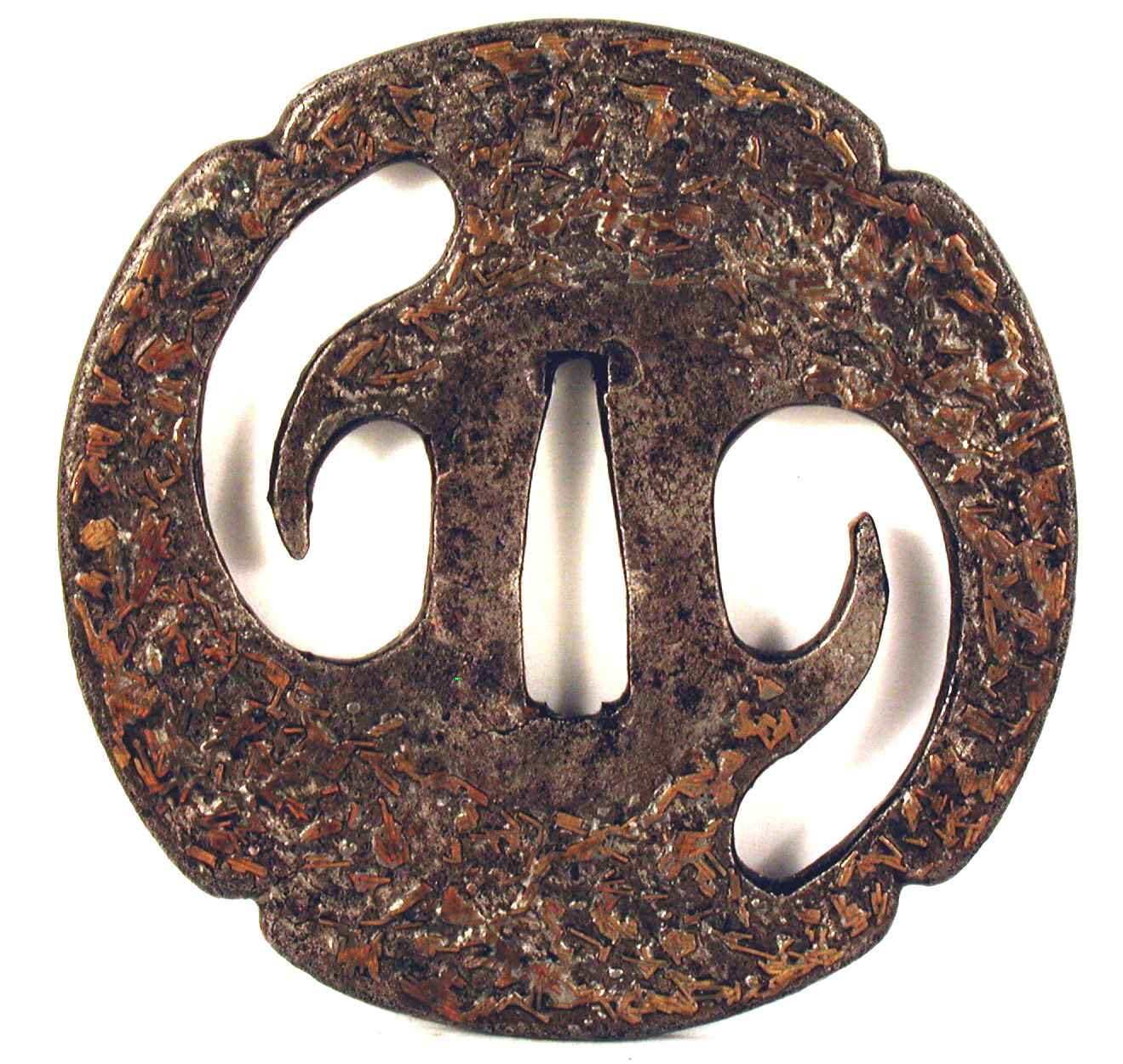 Історія Атрибуціi: 1961 р., Дашкевич В.Т., Ермітаж: залізна кована гарда з прорізним орнаментом, що включає в себе и отвори для кодзуки і когаї; поверхня прикрашена тонкою інкрустацією жовтою бронзою у вигляді численних шматочків бронзового дроту, що створює вигадливий орнамент. 15-16 ст./Кількість: 1