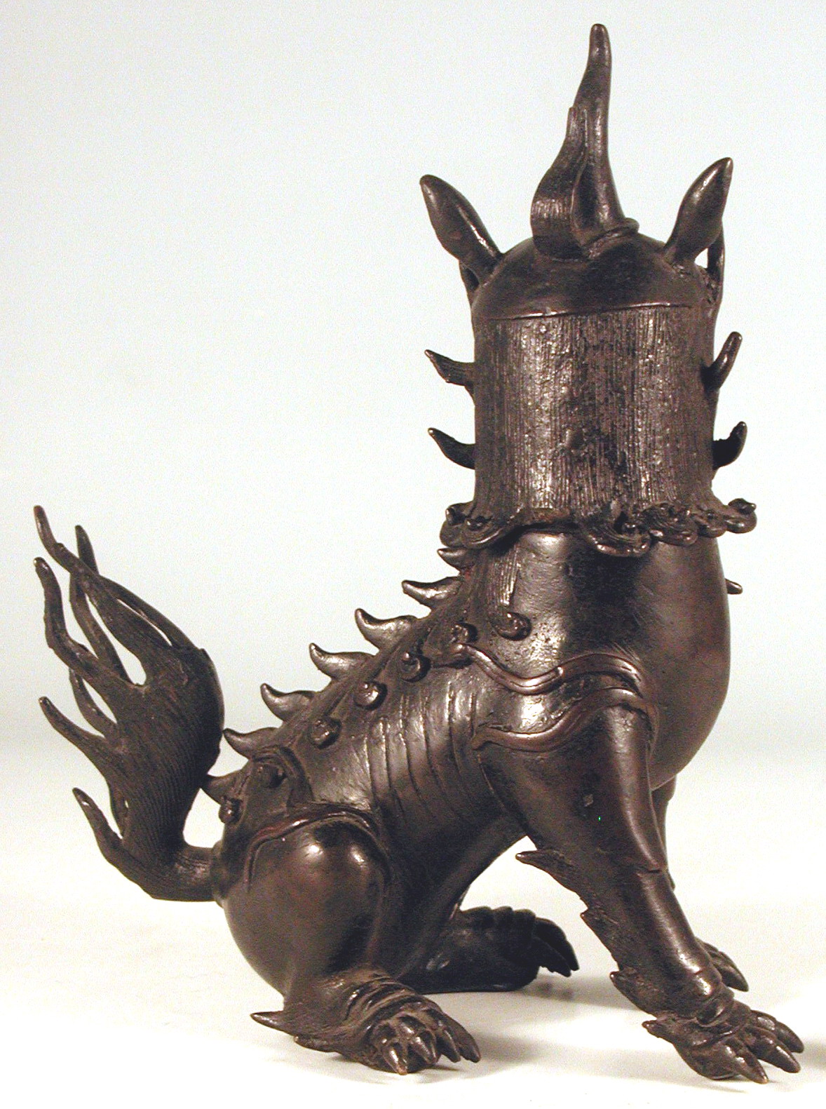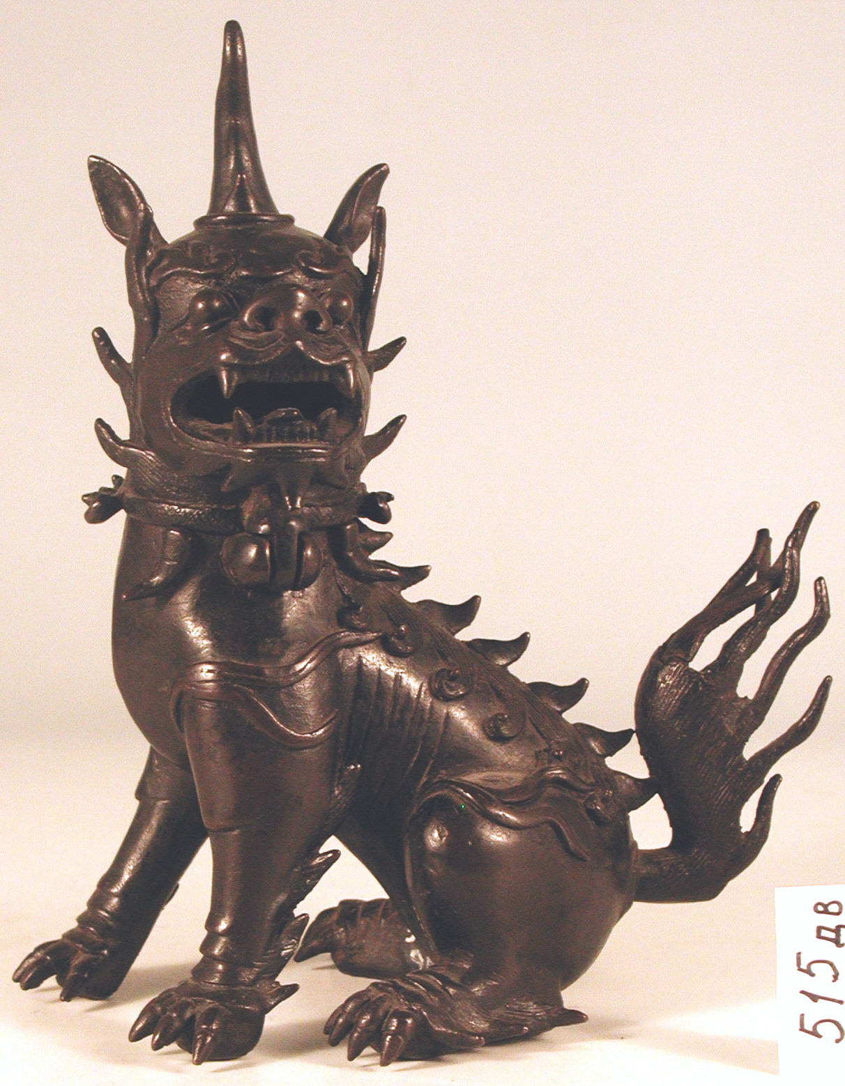 /Історія Атрибуціi: 1) О.Н. Глухарева. Музей східних культур. 1953 р: "Китай, 19 ст." 2) 1980 р. Галина Біленко під керівництвом Бабєнцової описує предмет як зображення циліня, благовіщого фантастичного звіра (інвентарна картка) 3) Логвин М.Ю, грудень 2016 «Чаофен – фантастична тварина, зображення якої розповсюджене в архітектурному декорі епох Мін і Цін. За народними переказами, вперше зафіксованими письменником Лі Дун-ян (1447-1516), чаофен є третім сином Дракона. Він символізує щастя, красу і сувору величність, служить оберегом від злих сил та нещасть.» 4) 2018 р, Чан Пен, працівник Інституту Конфуція при КНУ імені Тараса Шевченка: "Курильниця у вигляді такого звіра називається lu duan" (усна консультація) 5) Логвин - повертається до дослідження іконографії. Знайдено аналогію (див. Аналогії), де фантастичного звіра визначено як сє джи - тварину правосуддя (2023 рік)/Кількість: 1