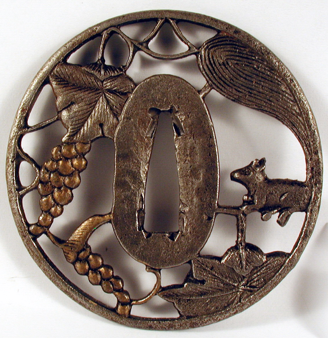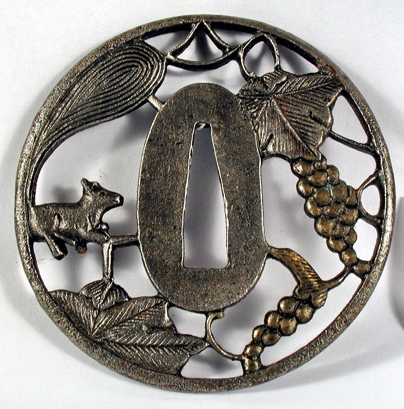 Закладка “Атрибуція” - Наим. предмета, издания: Цуба з зображенням білки та винограду/Змiн. розміри: 7,5 х 7,6 см/Змiн.додаток до назва (лист, ...): Цуба залізна круглої форми мару гата; має отвір накаго ана, оточений сеппа даї. Уся інша поверхня між ободом мімі та сеппа даї перфорована для створення позитивного зображення білки та листя і грона винограду./Змiн. час створення: 17 ст.Автор, автор съемки: Майстер школи Сьоамімісце створення, школа: ЯпоніяНовый материал: залізоНовый материал: бронзаИзм. техника: куванняИзм. техника: різьбленняИзм. техника: гравіруванняИзм. техника: інкрустація