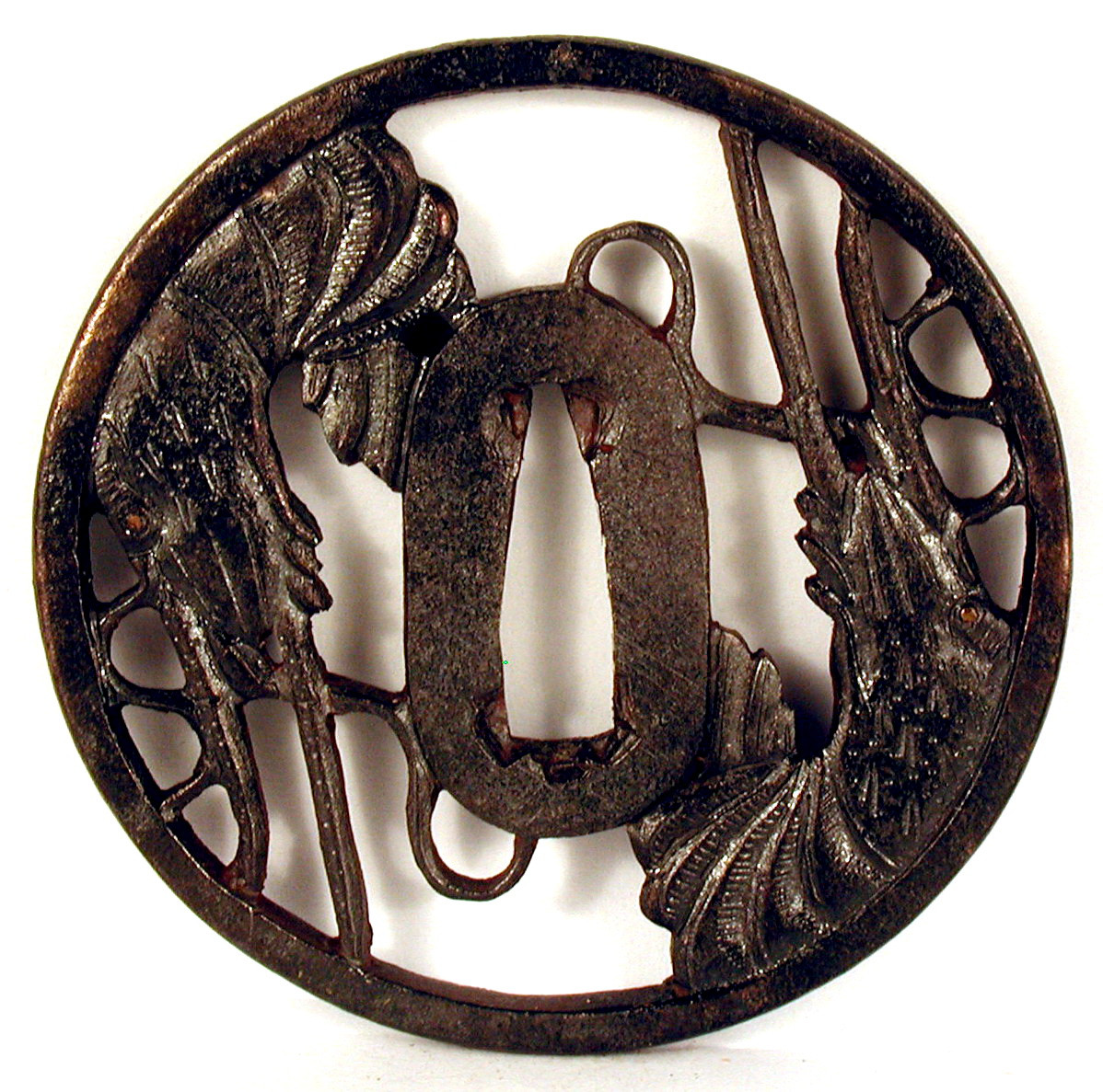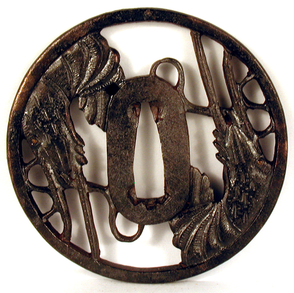 Закладка “Атрибуція” - Наим. предмета, издания: Цуба із зображенням голів двох ящірок (?)/Змiн. розміри: Д - 7,9 см/Змiн. час створення: XVII-XVIII ст.Новый материал: залізоНовый материал: бронзаИзм. техника: куванняИзм. техника: різьбленняИзм. техника: гравіруванняИзм. техника: інкрустація бронзою