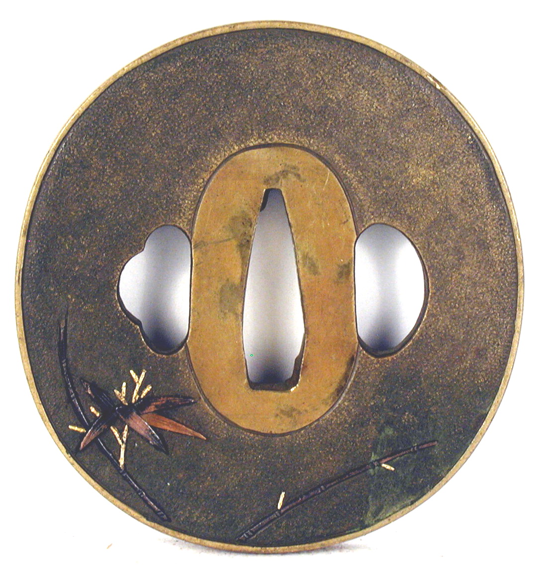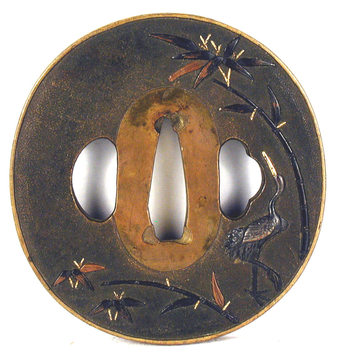Закладка “Атрибуція” - Наим. предмета, издания: Цуба із зображенням чаплі серед пагонів бамбука/Змiн. розміри: 6,6 х 6,9 смАвтор, автор съемки: Невідомий майстерИзм. техника: куванняИзм. техника: гравіруванняИзм. техника: позолотаИзм. техника: накладний рельєф