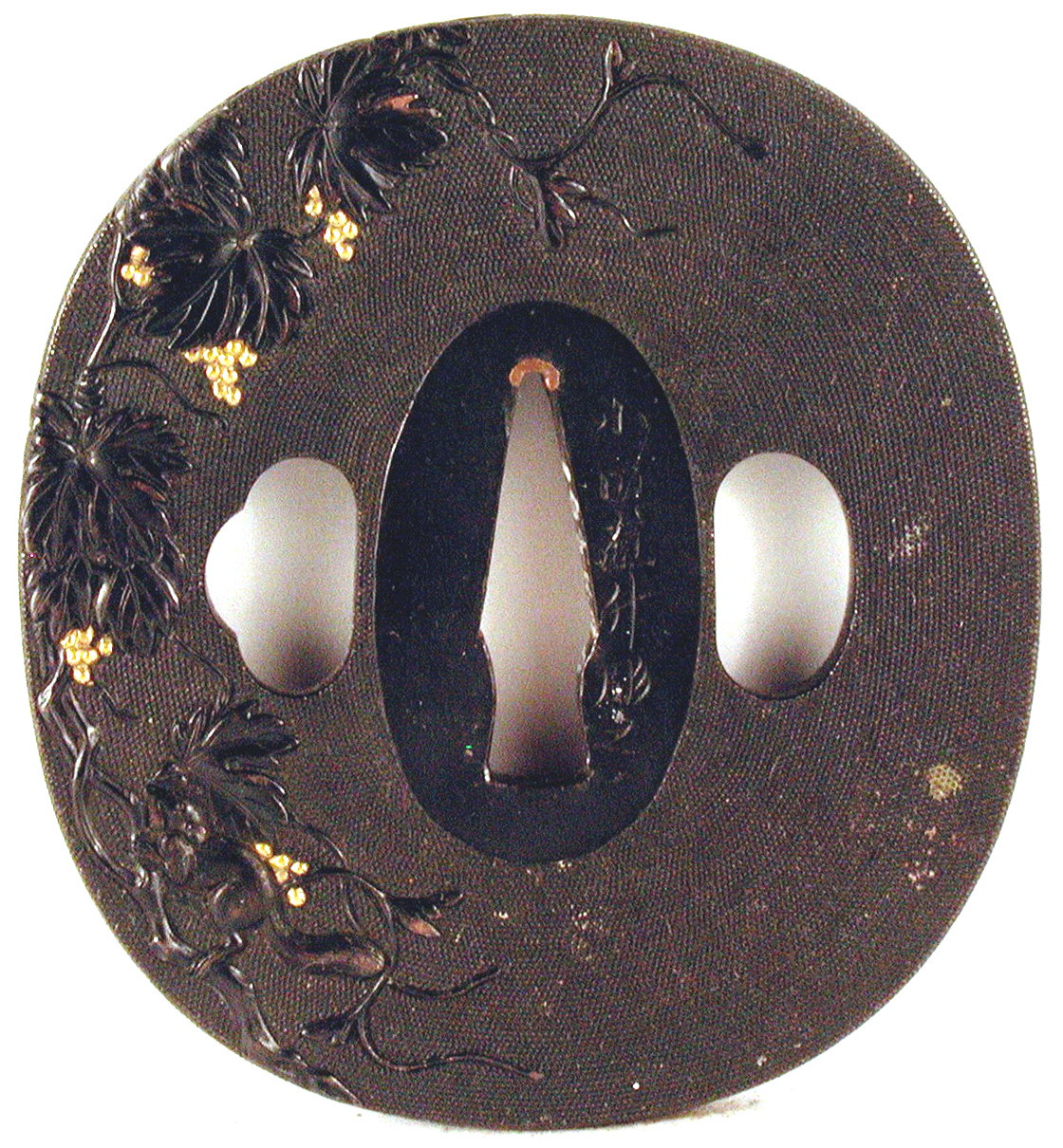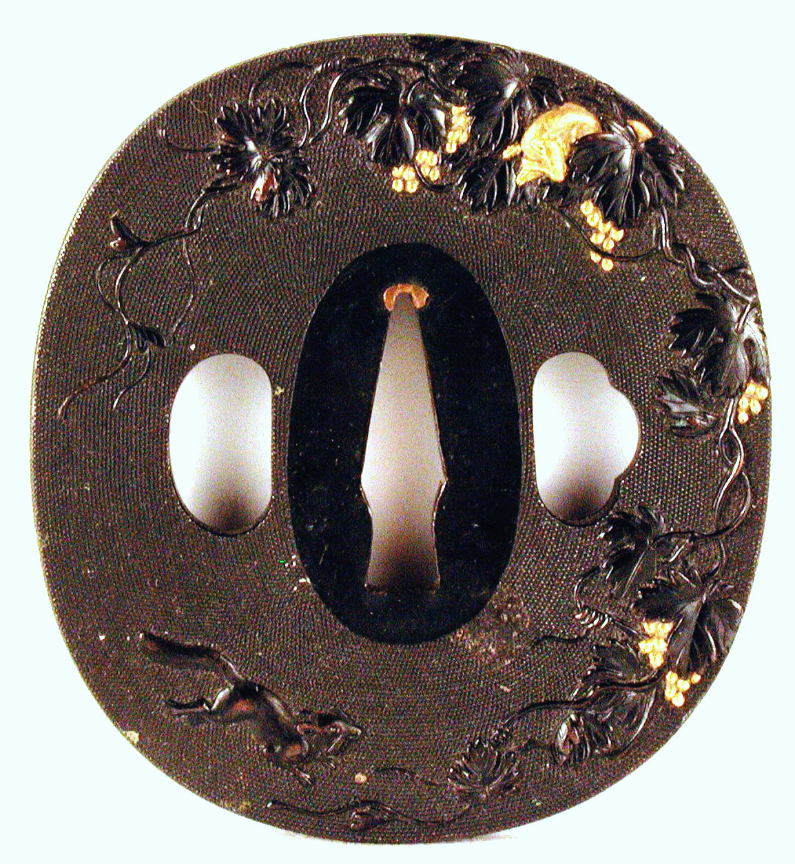 Закладка “Атрибуція” - Наим. предмета, издания: Цуба з зображенням білок і винограду/Змiн. розміри: 6,8 х 7,5 х 7,8 см/Змiн.додаток до назва (лист, ...): Цуба з сякудо, овальної форми нага-мару-гата з трьома отворами ріо-хіцу (rio hitsu). На карбованій з обох боків поверхні (техніка нанако) зображено: на аверсі – двох білок і виноградну лозу, на реверсі – білку на виноградній лозі. Центральний отвір наваго-ана має фігурний профіль і оснащений прокладками секігане./Змiн. Написи, клейма, марки: На реверсі праворуч від центрального отвору на сеппа-даі – підпис автора «Oda Naomasu hour» («Ода Наомасу різьбив» (або «гравіював»)./Змiн. час створення: Кінець 18 - початок 19 ст.Автор, автор съемки: Ода Наомасумісце створення, школа: СацумаНовый материал: сплав сякудоИзм. техника: куванняИзм. техника: гравіруванняИзм. техника: позолотаИзм. техника: накладний рельєфНовый материал: дорогоцінні металиИзм. техника: карбування