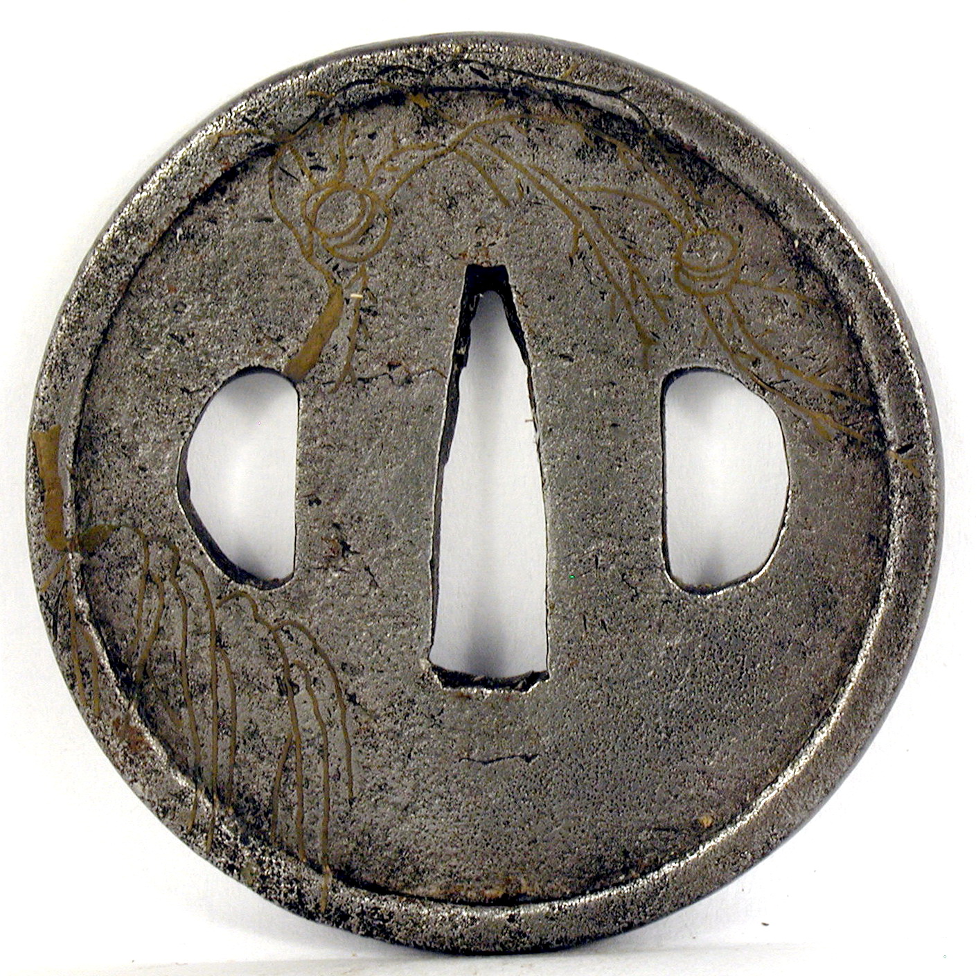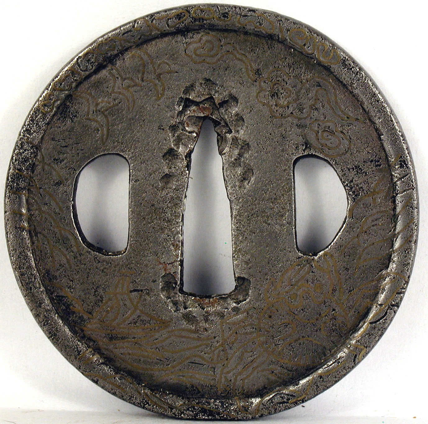Закладка “Атрибуція” - Наим. предмета, издания: Цуба із зображенням птахів, що летять/Змiн. розміри: Д - 6,7 смАвтор, автор съемки: Невідомий майстермісце створення, школа: провінція ХідзенИзм. техника: куванняИзм. техника: інкрустація бронзою