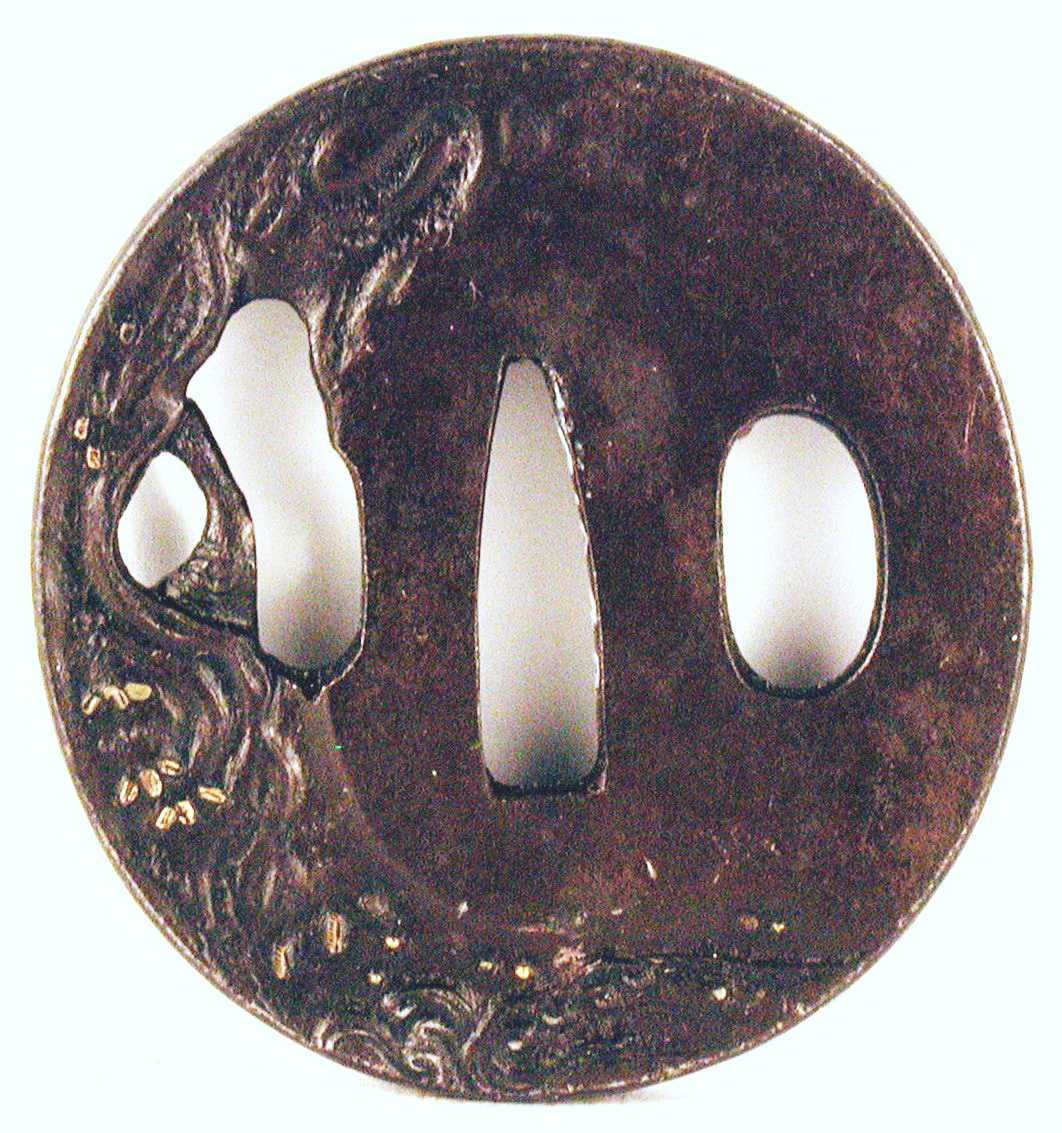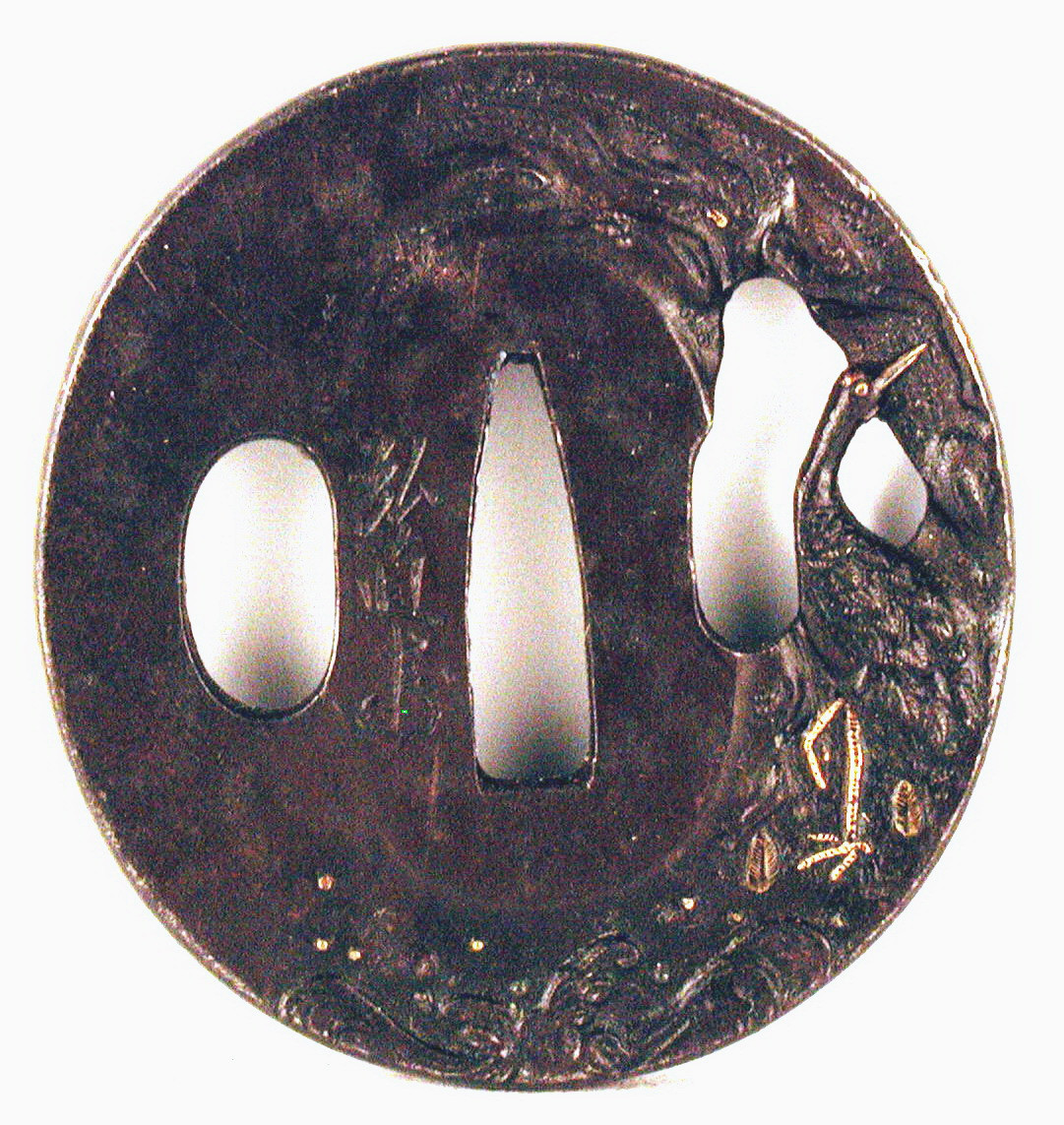 Закладка “Атрибуція” - Наим. предмета, издания: Цуба із зображенням чаплі/Змiн. розміри: 5,8 х 6,2 см/Змiн. час створення: Перша половина XIX ст.Автор, автор съемки: Хіронаомісце створення, школа: школа УчікошіНовый материал: залізоНовый материал: бронзаИзм. техника: куванняИзм. техника: гравіруванняИзм. техника: різьбленняИзм. техника: інкрустація бронзою