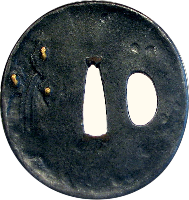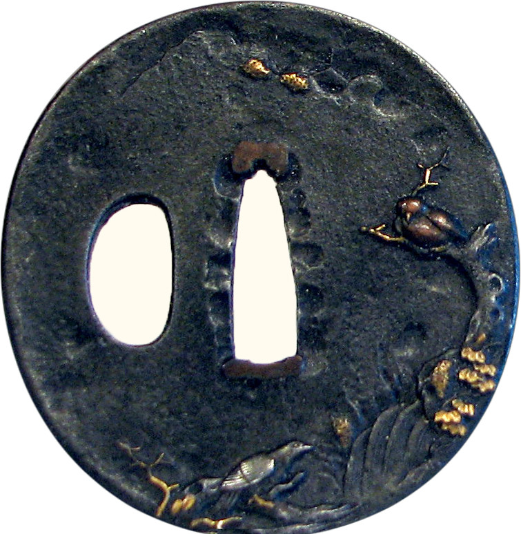 Закладка “Атрибуція” - Наим. предмета, издания: Цуба із зображенням пташкі на гіллі/Змiн. розміри: 6,2 х 6,7 см/Змiн. час створення: XVIII-XIX ст.Автор, автор съемки: Невідомий майстерИзм. техника: куванняИзм. техника: гравіруванняИзм. техника: накладний рельєфИзм. техника: інкрустація золотом