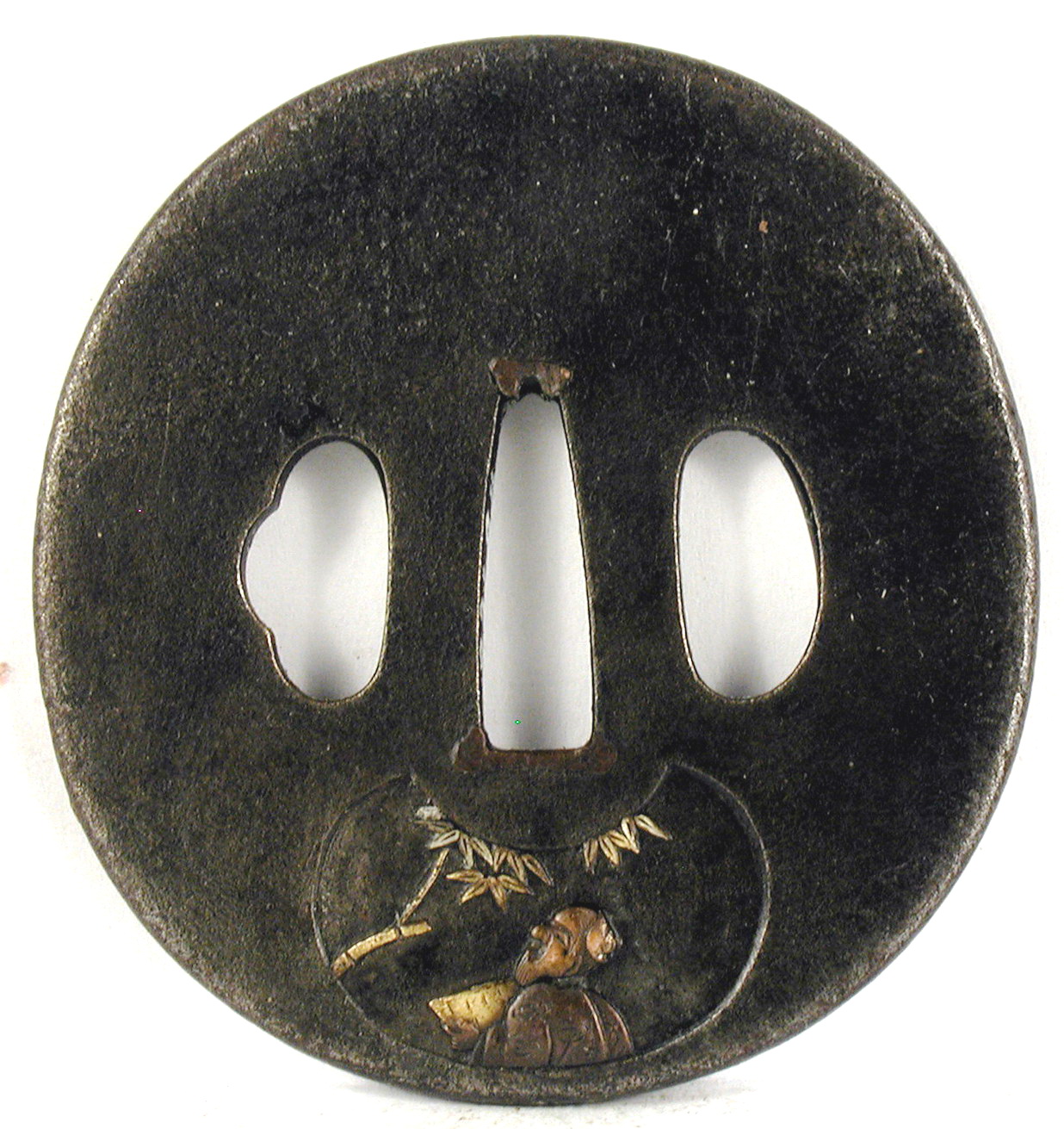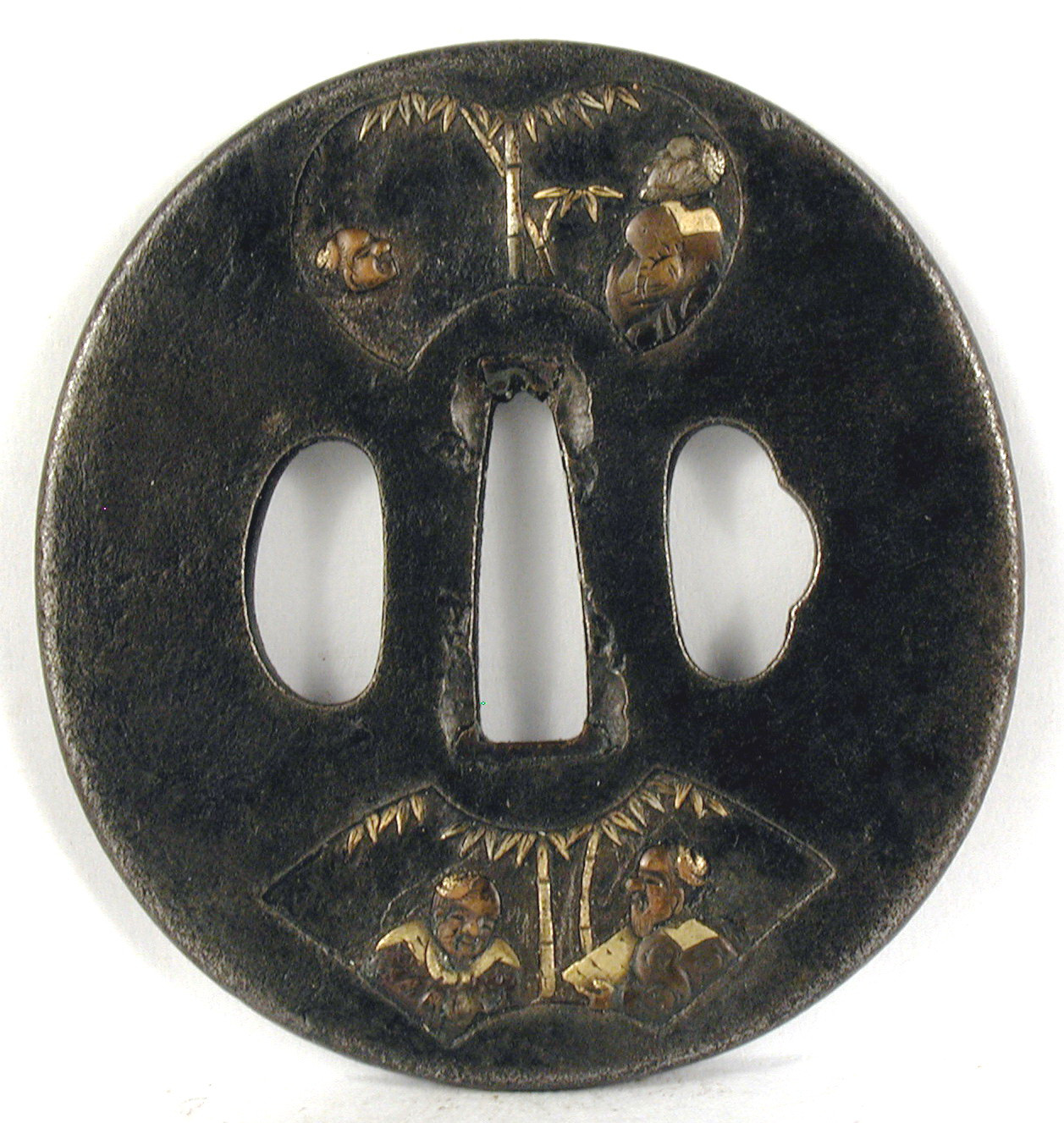 Закладка “Атрибуція” - Наим. предмета, издания: Цуба із зображенням китайських мислителів/Змiн. розміри: 7,2 х 7,6 смАвтор, автор съемки: Невідомий майстерИзм. техника: куванняИзм. техника: гравіруванняИзм. техника: накладний рельєфИзм. техника: позолотамісце створення, школа: ЯпоніяИзм. техника: інкрустація