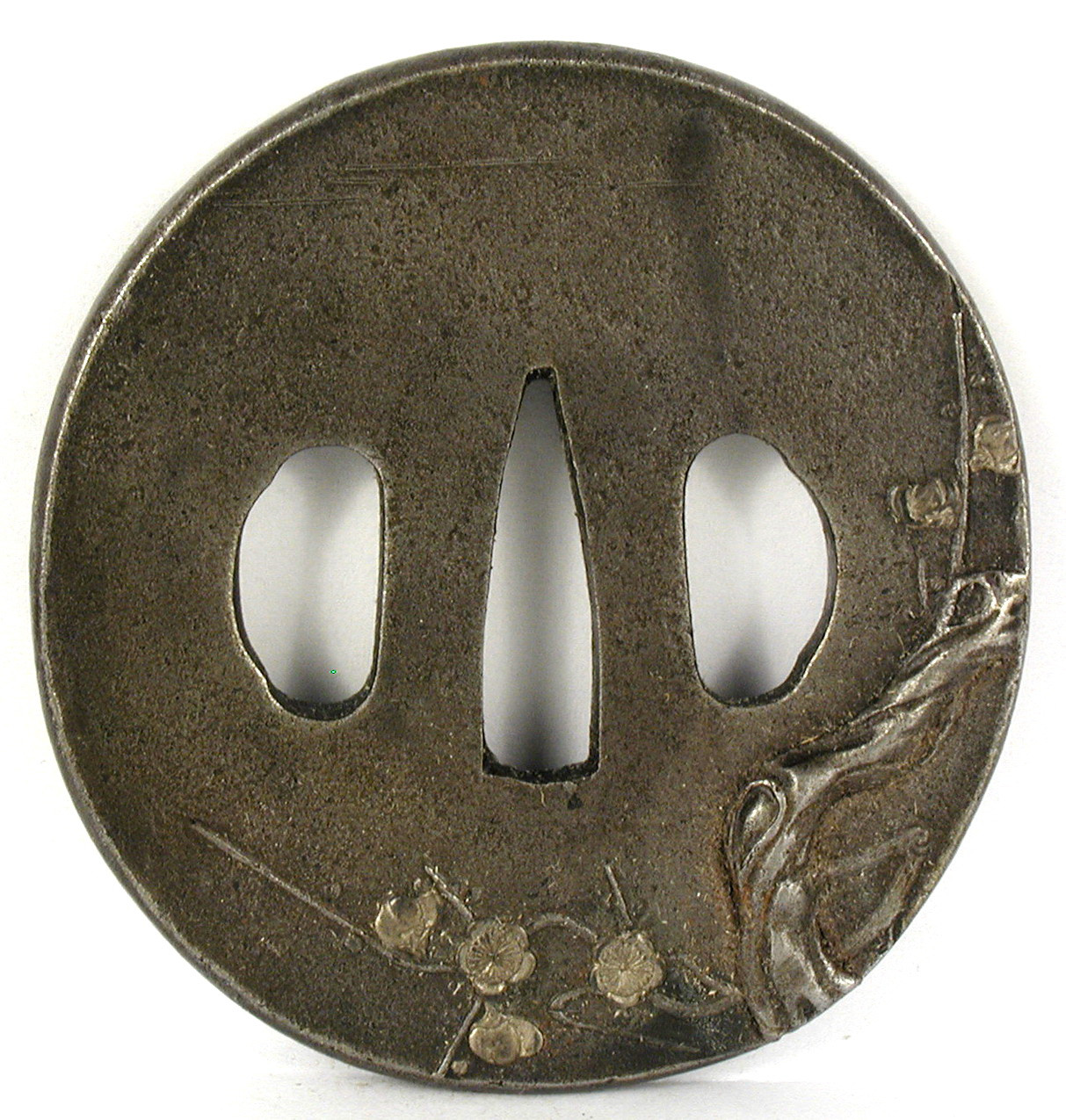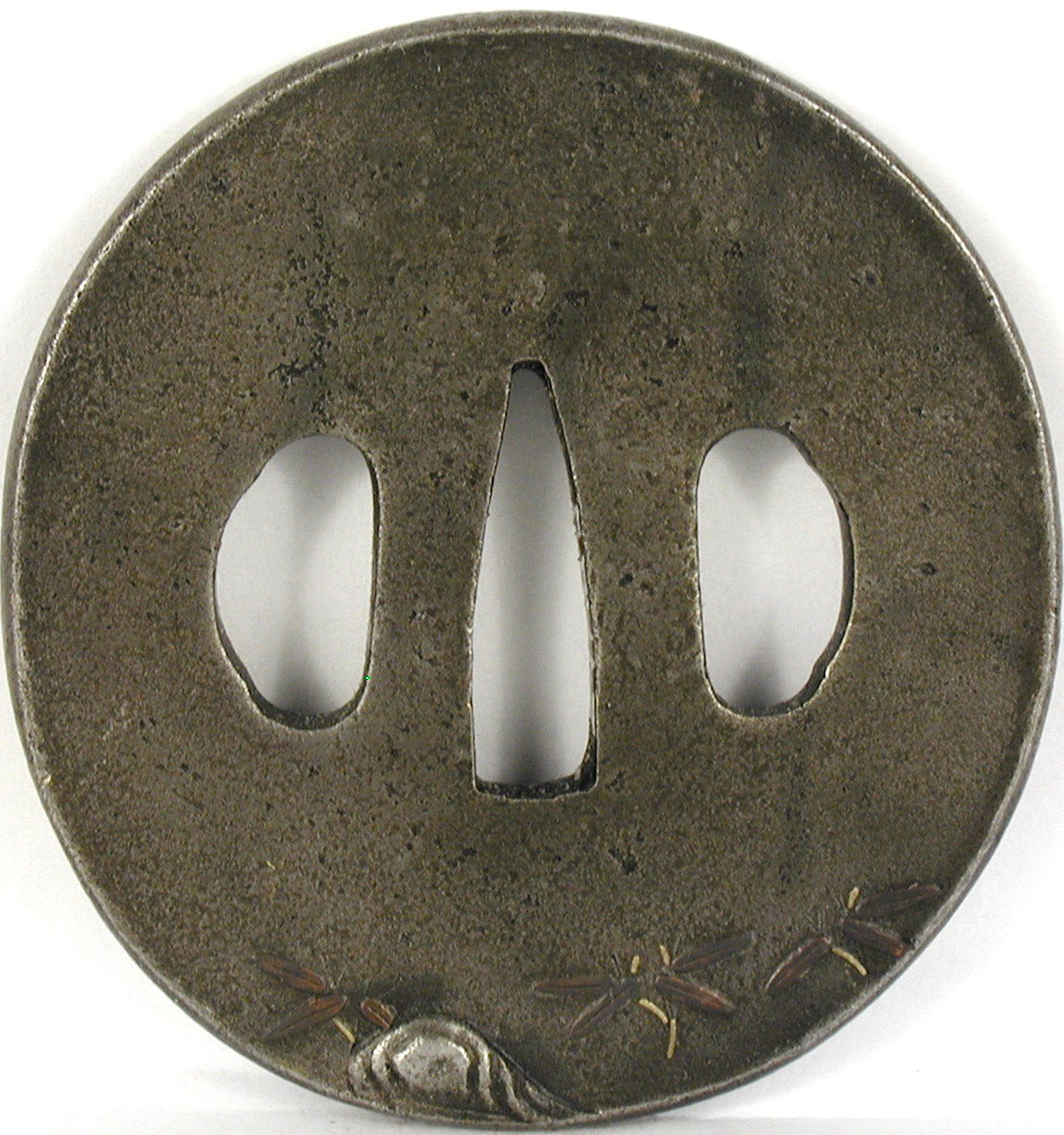 Закладка “Атрибуція” - Змiн. розміри: 7,1 х 7,5 см/Змiн. час створення: Перша половина XVIII ст.Автор, автор съемки: Невідомий майстермісце створення, школа: стиль школи НараНовый материал: залізоНовый материал: мідьИзм. техника: куванняИзм. техника: гравіруванняИзм. техника: накладний рельєфИзм. техника: інкрустація