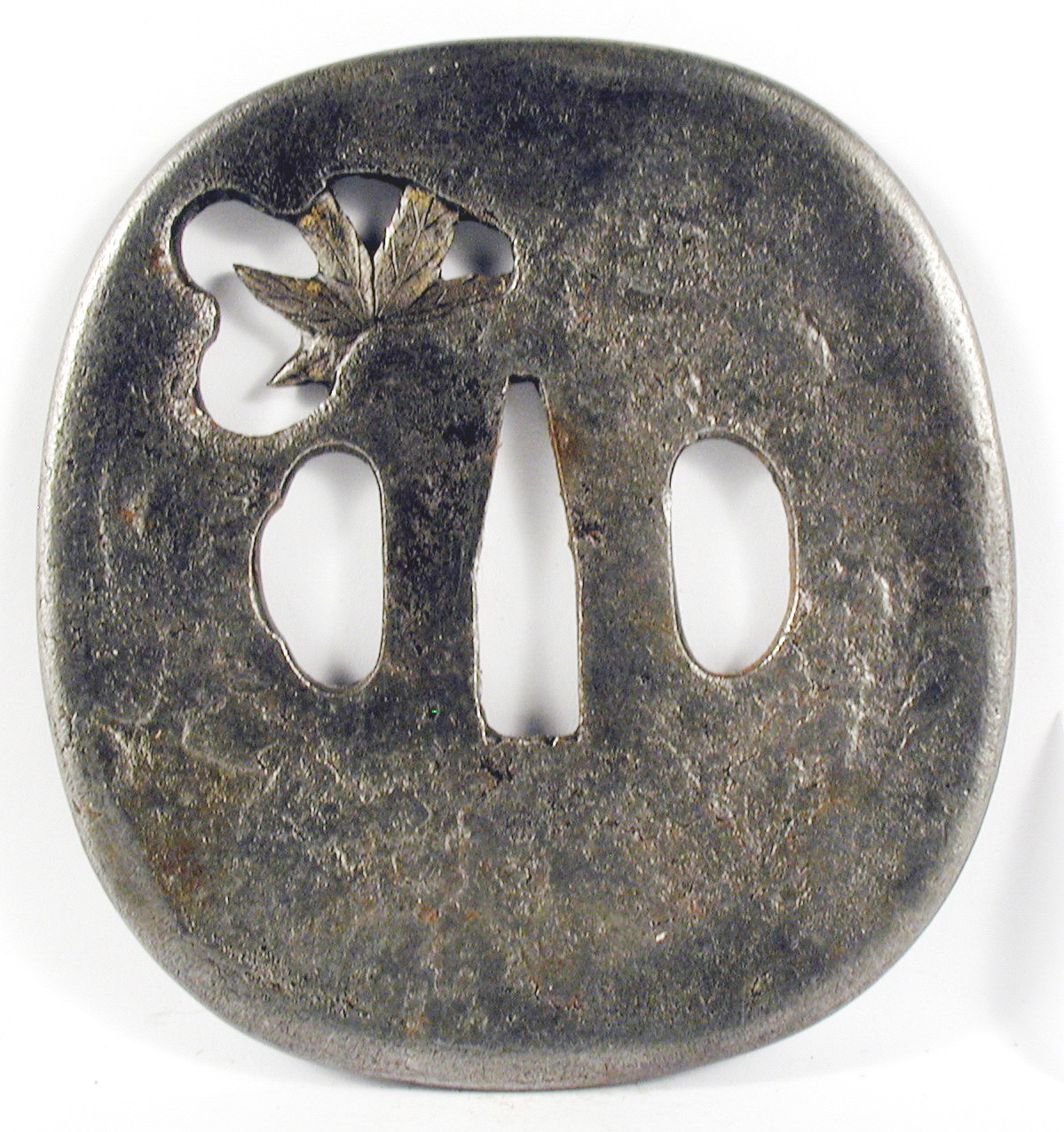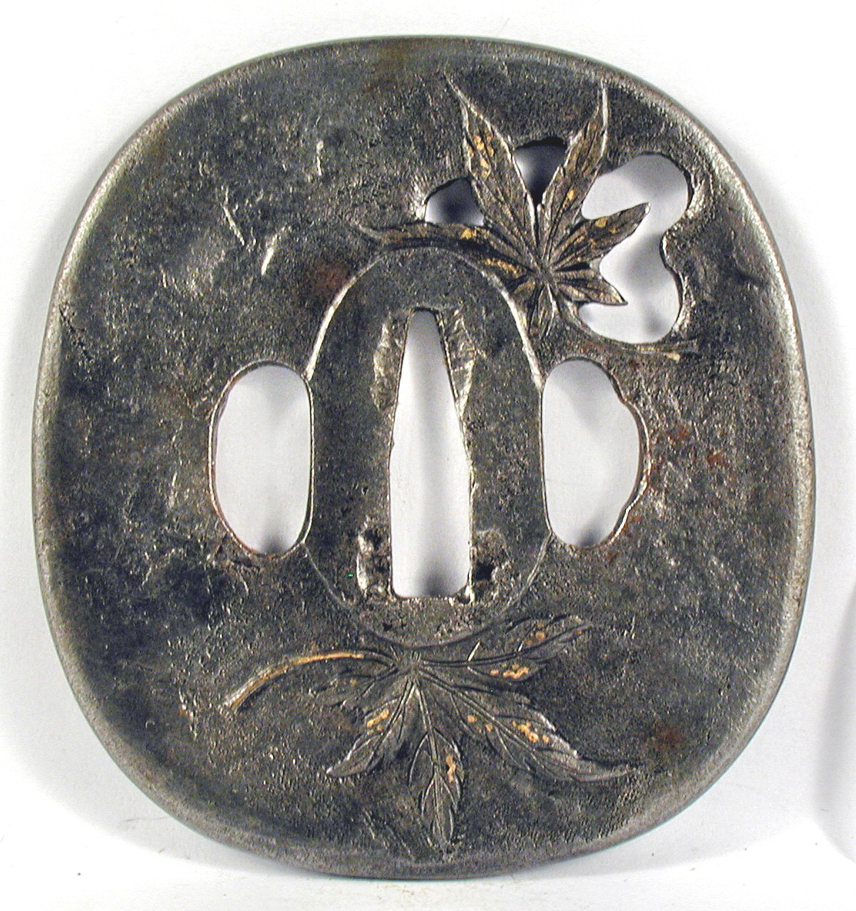 Закладка “Атрибуція” - Наим. предмета, издания: Цубі із зображенням кленового листя/Змiн. розміри: 7,9 х 8,8 см/Змiн.додаток до назва (лист, ...): Цуба залізна форми нага мару гата, з тонким рельєфним краєм, Має три отвори ріо хіцу. Декорована зображенням листя клена в низькому рельєфі, лист праворуч угорі зображено на фоні отвору неправильної форми і модельовано з обох боків. Деталі зображення модельовано золотом у техніці нуномедзоган./Змiн. час створення: 17 ст.Автор, автор съемки: Майстер школи СьоаміНовый материал: залізоИзм. техника: куванняИзм. техника: гравіруванняИзм. техника: різьбленняИзм. техника: інкрустаціямісце створення, школа: ЯпоніяНовый материал: дорогоцінні метали