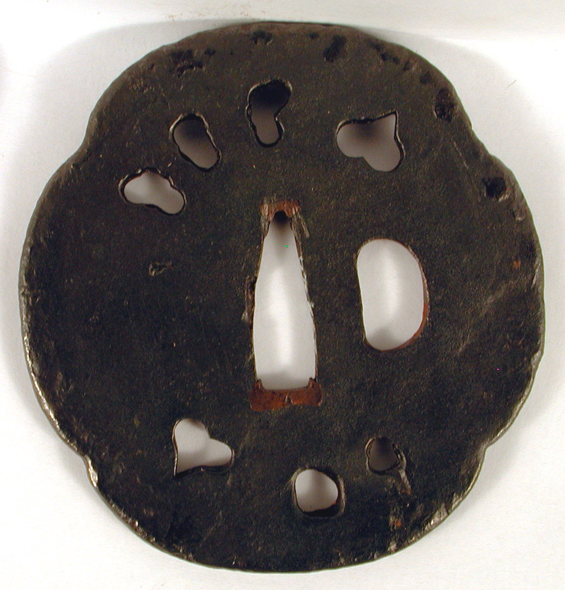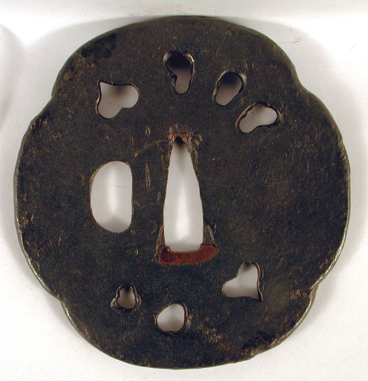 Авторські підписи, клейма: Уздовж центрального отвору гравіровано підпис (не прочитано)./Історія Атрибуціi: 1. Консультація 1961 р. наукового співробітника Державного Ермітажу, канд. іст. наук В.Т. Дашкевич: пізня річ. По типу творів майстрів-зброярів 13-14 ст./Кількість: 1