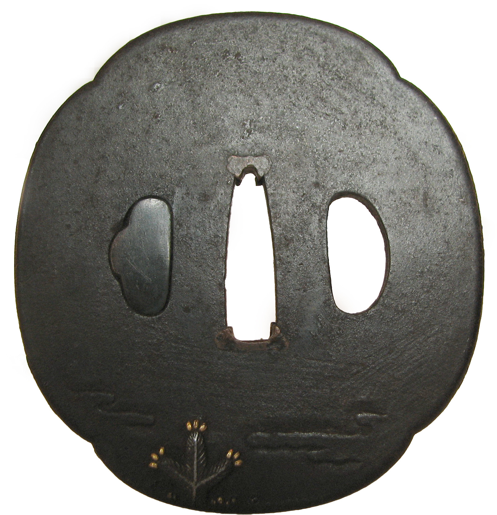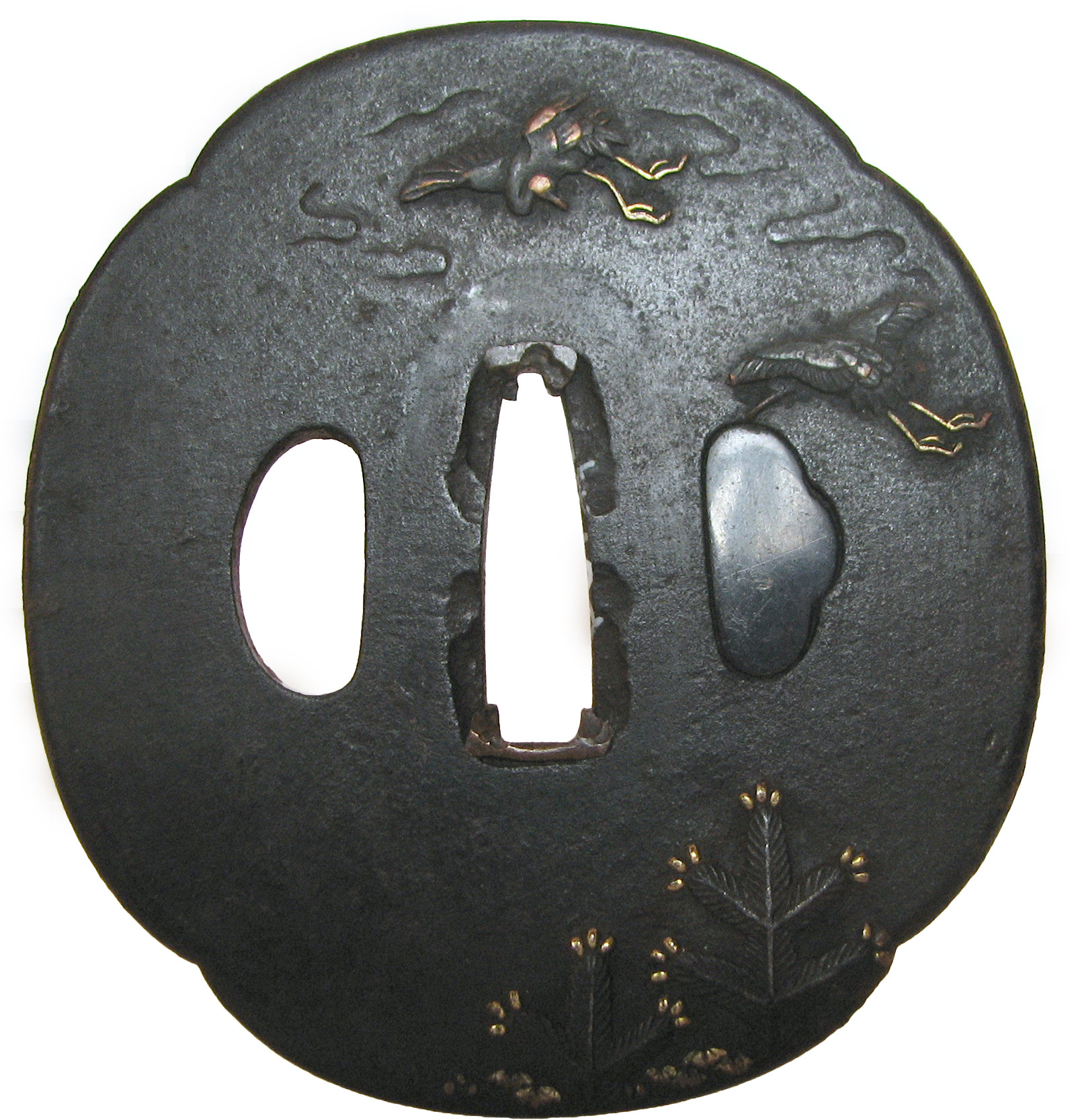Закладка “Атрибуція” - Наим. предмета, издания: Цуба із зображенням двох веселиків/Змiн. розміри: 7,0 х 7,6 х 7,7 см/Змiн. час створення: 18-19 ст.Автор, автор съемки: Невідомий майстерИзм. техника: куванняИзм. техника: гравіруванняИзм. техника: накладний рельєфИзм. техника: інкрустація бронзоюИзм. техника: позолота