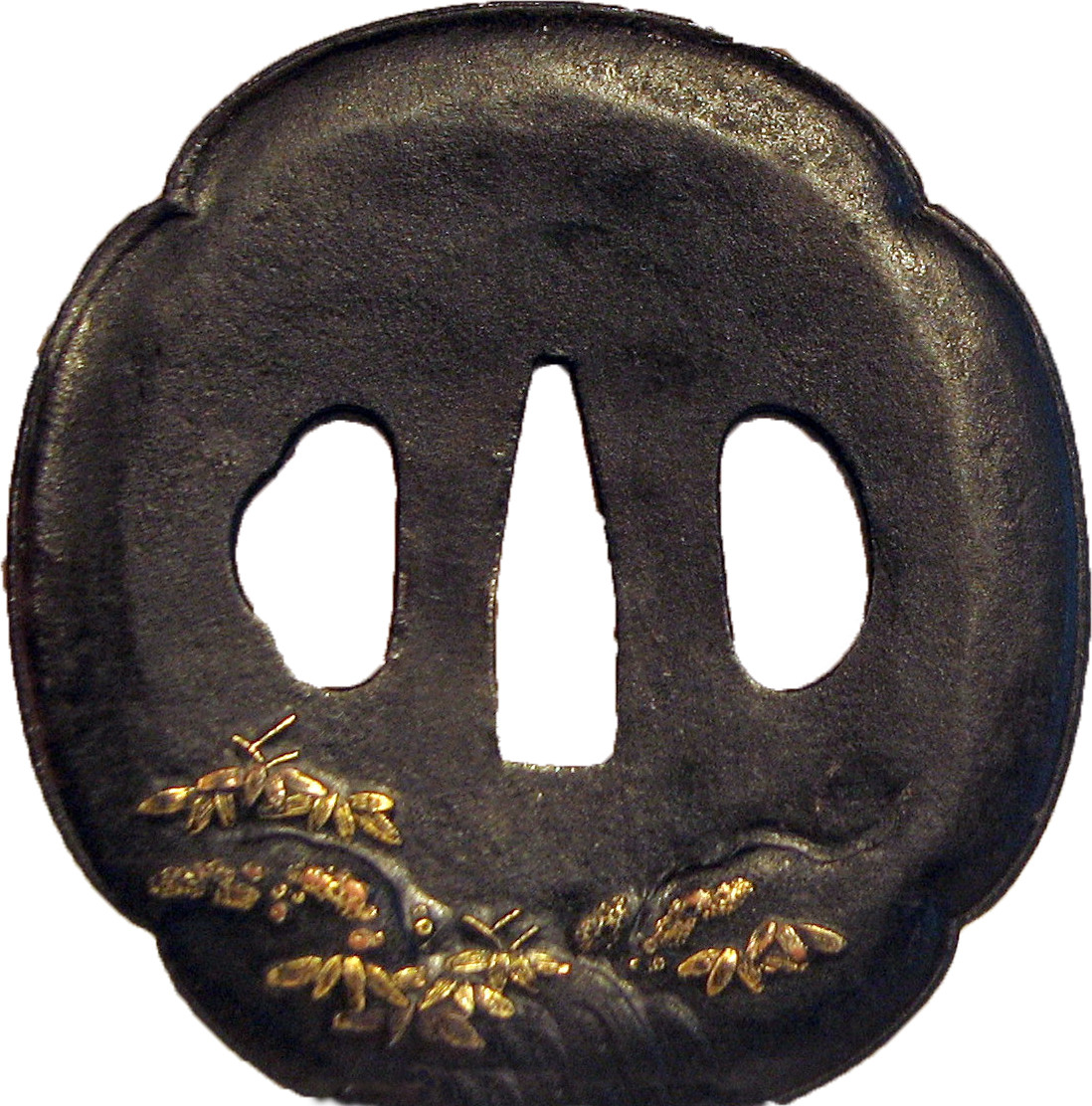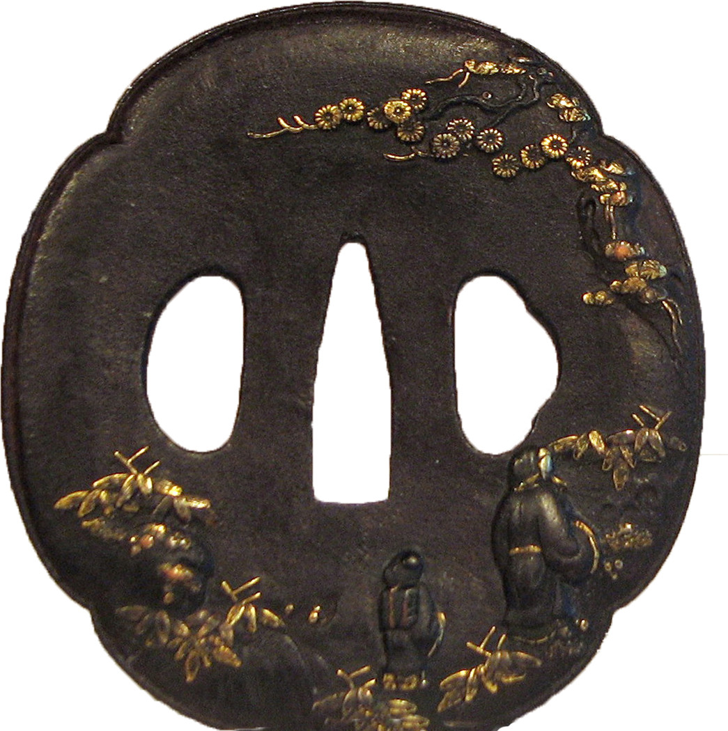 Закладка “Атрибуція” - Наим. предмета, издания: Цуба із зображенням китайського мудреця зі служкою/Змiн. розміри: 6,9 х 7,5/Змiн.додаток до назва (лист, ...): Цуба залізна мокко форми(maru gata), з рельєфним краєм (mimi) та трьома отворами ріо хіцу. На аверсі зображено китайського мудреця зі хлопчиком-служкою поруч з водоспадом і сосною. На реверсі – гілки квітучого дерева над потоком./Змiн. час створення: 17 ст.Автор, автор съемки: Невідомий майстермісце створення, школа: школа НараИзм. техника: куванняИзм. техника: гравіруванняИзм. техника: інкрустаціяИзм. техника: позолота