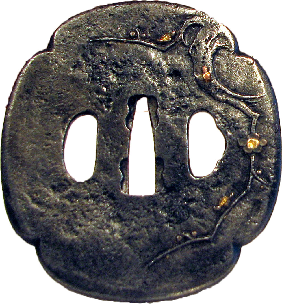 Закладка “Атрибуція” - Наим. предмета, издания: Цуба із зображенням гілки квітучої сливи/Змiн. розміри: 7,8 х 8,5 см/Змiн.додаток до назва (лист, ...): Цуба залізна мокко форми з рельєфно піднятим краєм; трьома отворами ріо-хіцу (rio hitsu). На аверсі зображено фрагмент гілки сливи з квітками. На реверсі – квітка сливи./Змiн. час створення: Перша половина 18 ст.Автор, автор съемки: Невідомий майстермісце створення, школа: стиль школи НараИзм. техника: куванняИзм. техника: гравіруванняИзм. техника: інкрустаціяИзм. техника: позолотаНовый материал: залізоНовый материал: бронзаНовый материал: дорогоцінні метали