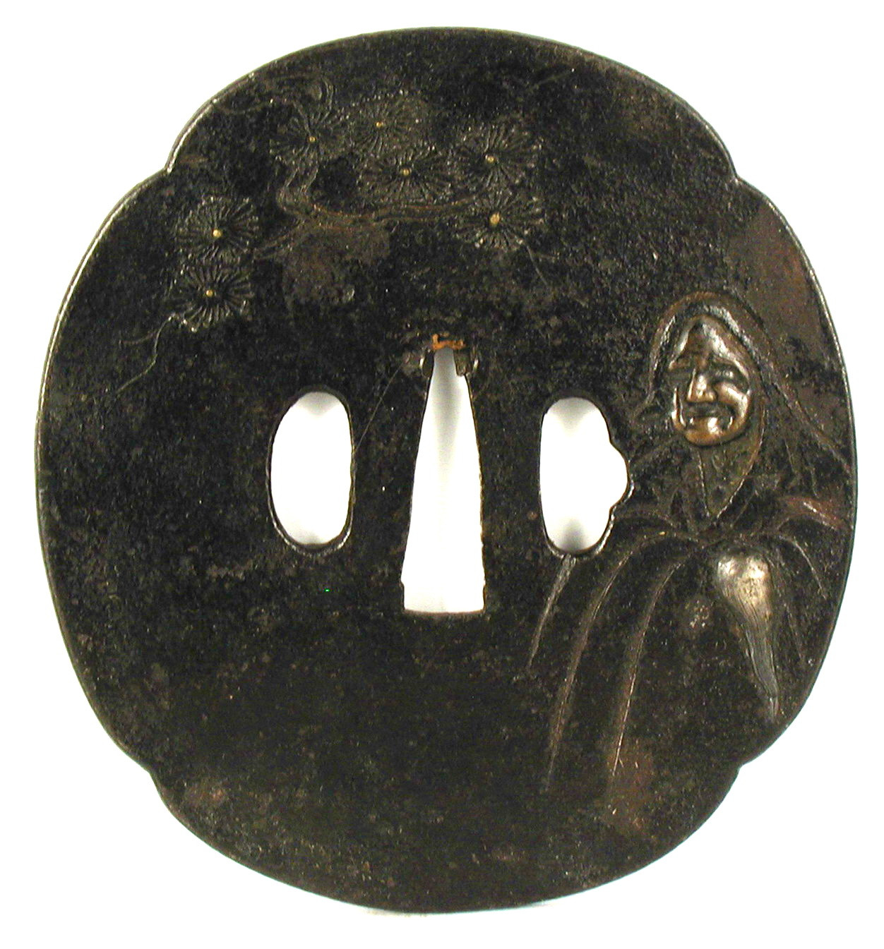 Закладка “Атрибуція” - Наим. предмета, издания: Цуба з зображенням буддійського святого Даруми/Змiн. розміри: 11,1 х 10, 25 см/Змiн.додаток до назва (лист, ...): Цуба залізна мокко форми з тонким рельєфним краєм мімі, має три отвори ріо хіцу. На аверсі зображено Бодхідхарму (яп. Дарума) у чернечому вбранні та гілки сосни над ним. На реверсі – гілка сосни./Змiн. час створення: Кінець 16 - початок 17 ст.Автор, автор съемки: Майстер школи Канеіемісце створення, школа: провінція ЯмасіроИзм. техника: куванняИзм. техника: гравіруванняИзм. техника: накладний рельєфИзм. техника: інкрустація