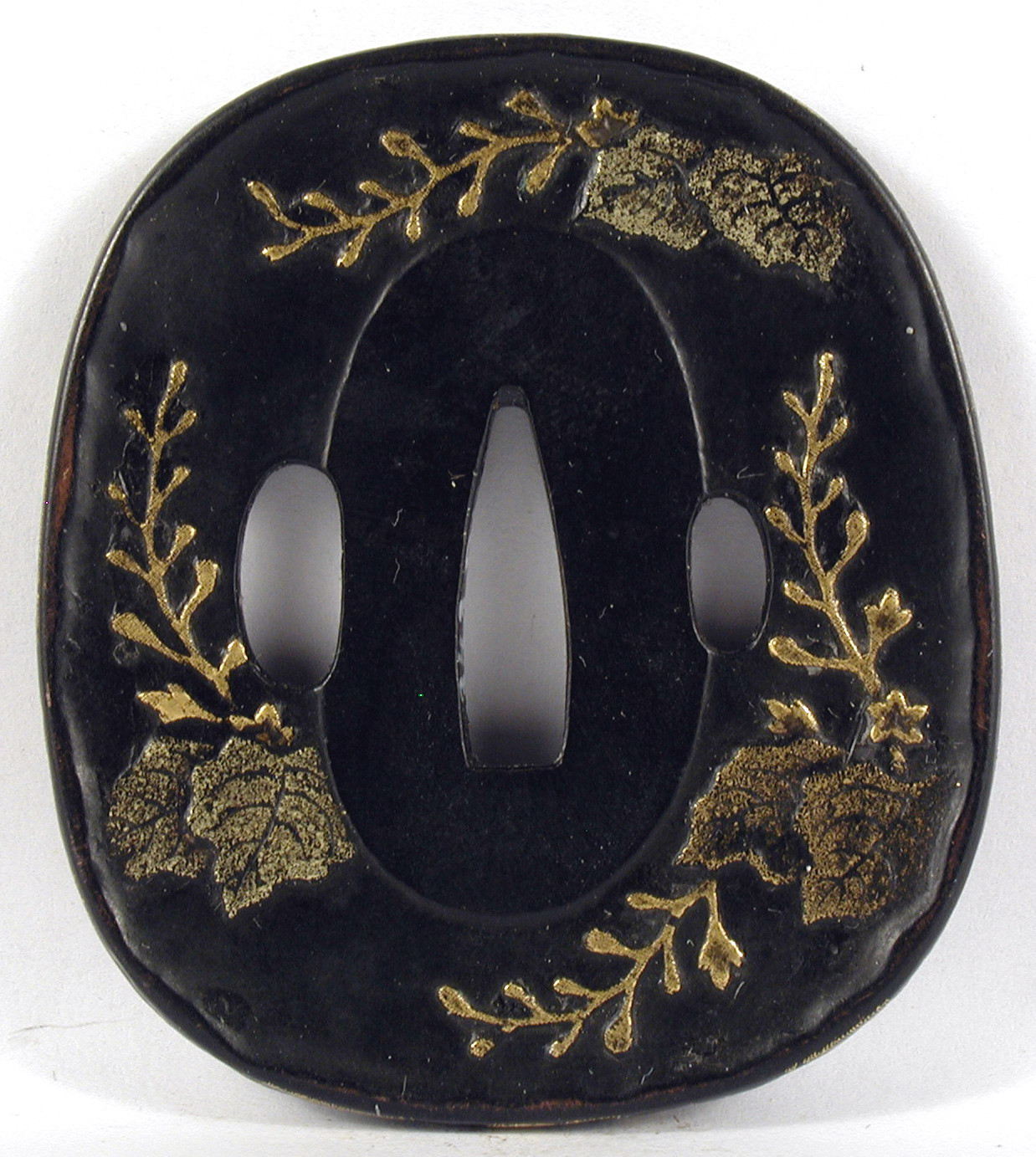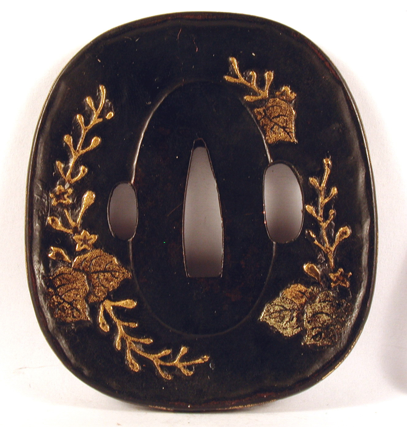 Закладка “Атрибуція” - Наим. предмета, издания: Цуба із зображенням трьох квітучих гілочок павлонії/Змiн. розміри: 5,6х 6,6 см/Змiн.додаток до назва (лист, ...): Цуба із сякудо, близькою до овалу форми (Aori gata), зі злегка піднятим рельєфним краєм (мімі), з трьома отворами ріо хіцу ана: правий когаі отвір правильного пропорційного розміру, лівий отвір (теж форми когаі) – маленький і досягає сеппа (можливо прорізано додатково). З обох боків декорована інкрустованим золотом зображенням трьох гілочок павлонії./Змiн. час створення: 17 ст.Автор, автор съемки: Майстер школи Сьоамімісце створення, школа: ЯпоніяНовый материал: сплав сякудоИзм. техника: куванняИзм. техника: інкрустаціяНовый материал: дорогоцінні метали