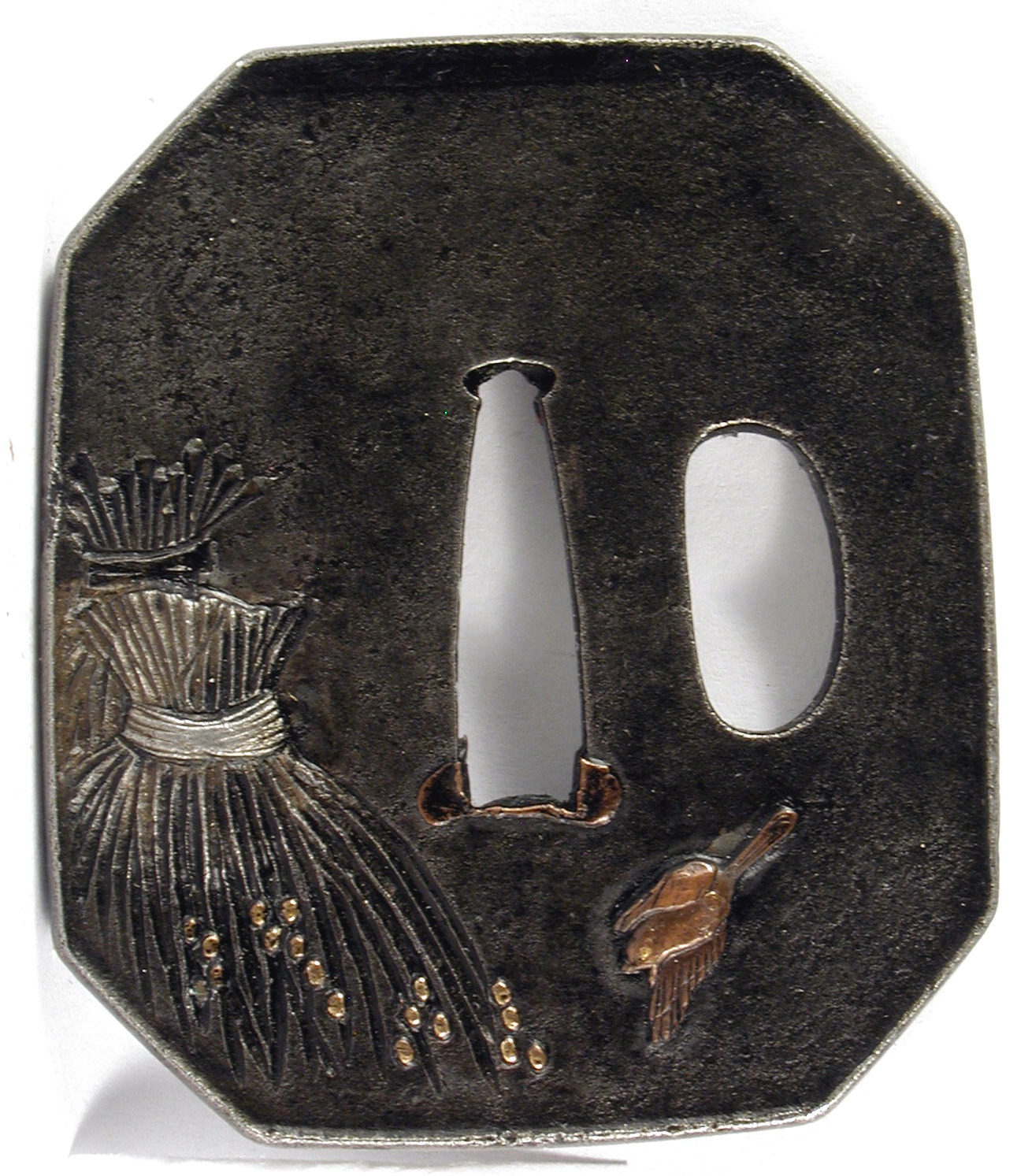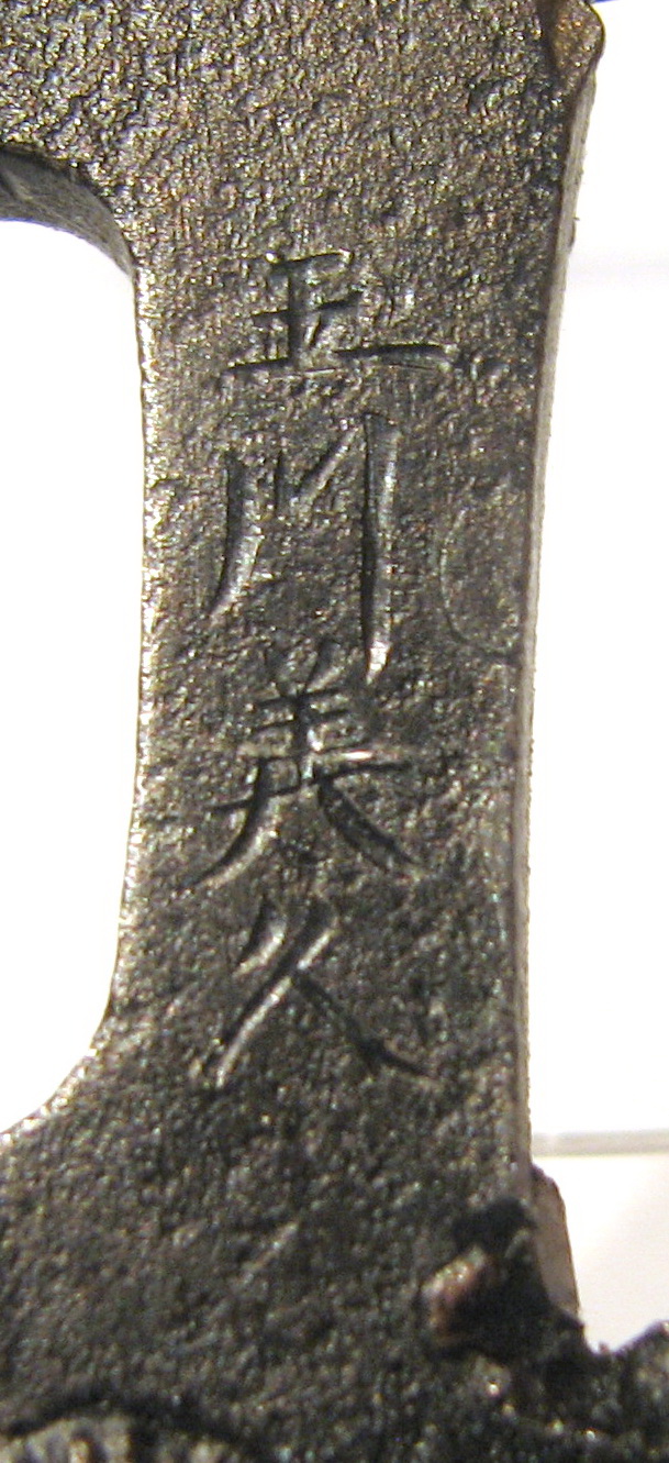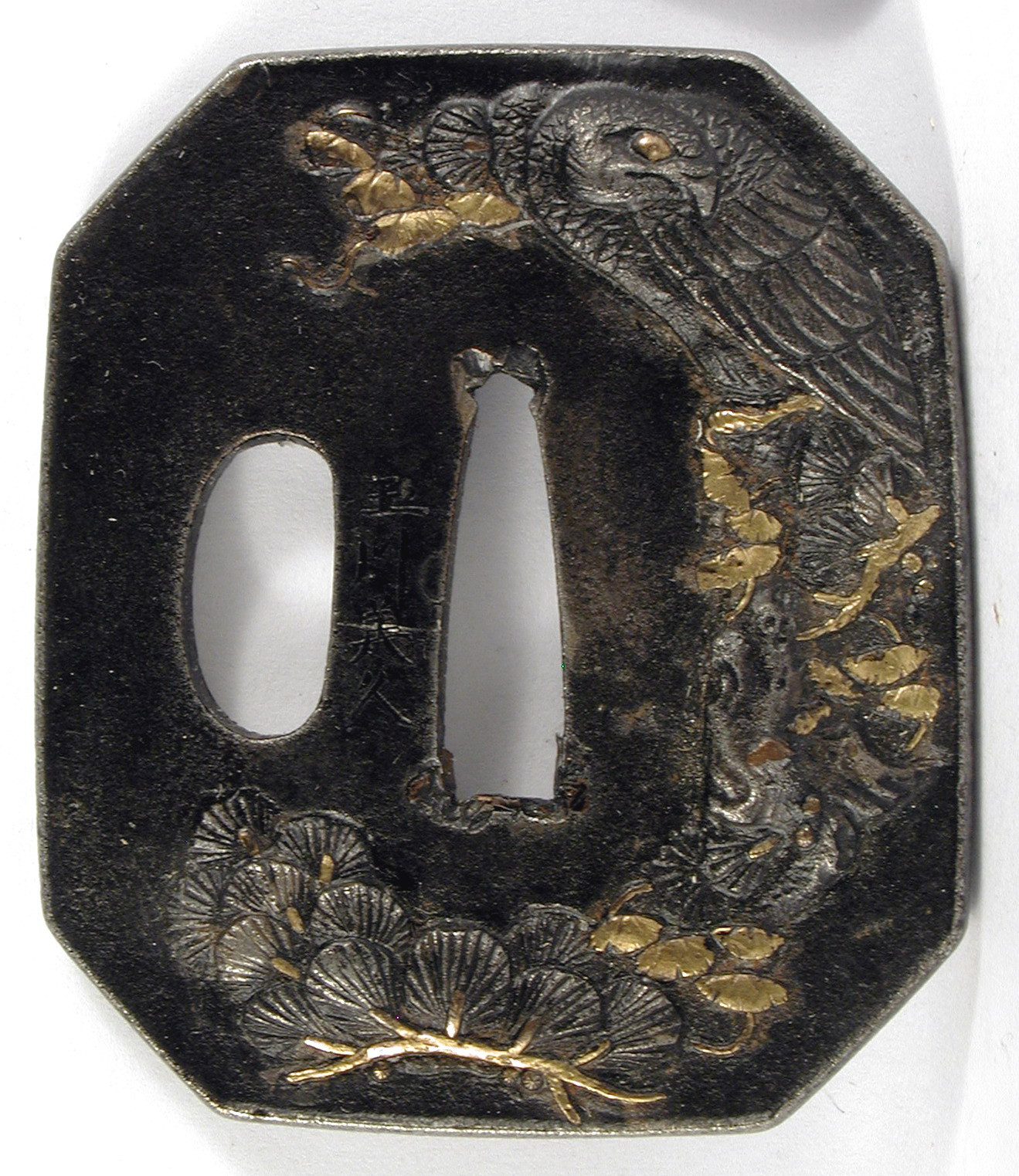 Авторські підписи, клейма: Уздовж центрального отвору гравіровано підпис: Тамагава Йосіхіса./Історія Атрибуціi: 1. Консультація 1961 р. наукового співробітника Державного Ермітажу, канд. іст. наук В.Т. Дашкевич: залізо, інкрустація позолоченою бронзою. Орел на сосні. Підпис: Тамагава Йосіхіса. Мешкав у провінції Хітаті в м. Міто. 18 - перша половина 19 ст./Кількість: 1