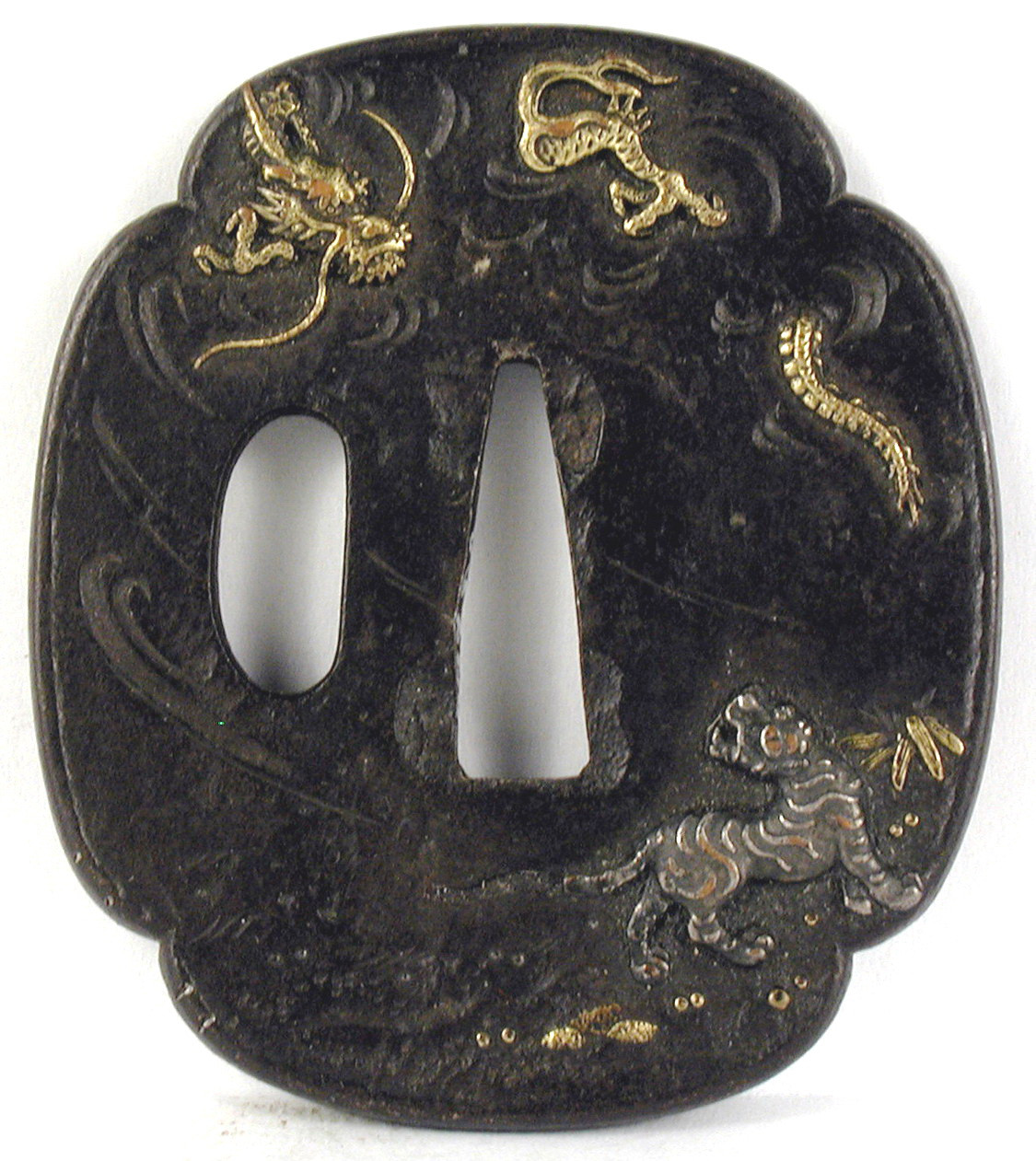 Закладка “Атрибуція” - Наим. предмета, издания: Цуба із зображенням дракона й тигра/Змiн. розміри: 6,4 х 7,3 х 7,5 см/Змiн. час створення: XVIII ст.Автор, автор съемки: Невідомий майстерНовый материал: залізоНовый материал: бронзаИзм. техника: куванняИзм. техника: гравіруванняИзм. техника: накладний рельєфИзм. техника: інкрустаціяИзм. техника: позолотаИзм. техника: сріблення