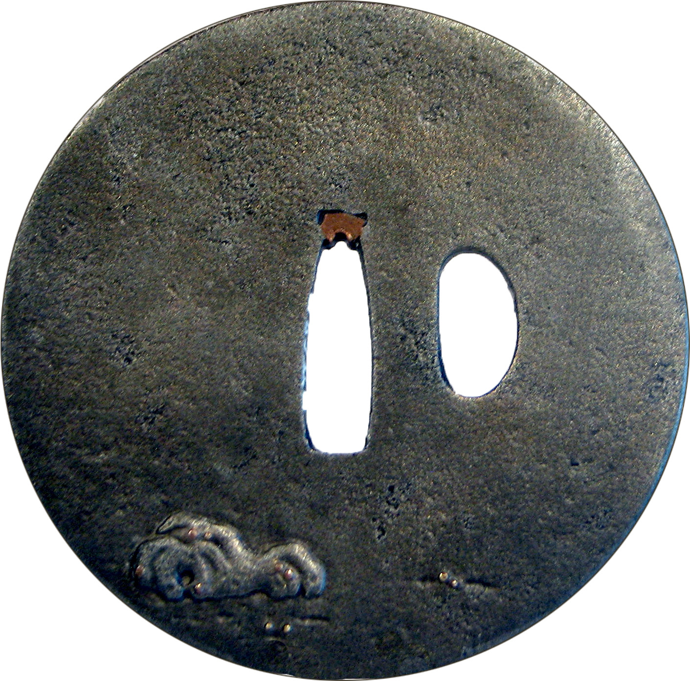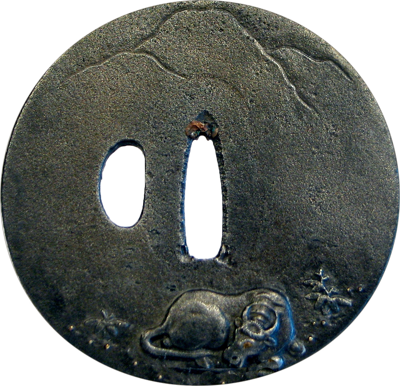 Закладка “Атрибуція” - Наим. предмета, издания: Цуба із зображенням вола/Змiн. розміри: Д - 8,2 см/Змiн. час створення: 18 - 19 ст.Автор, автор съемки: Невідомий майстерИзм. техника: куванняИзм. техника: гравіруванняИзм. техника: інкрустація бронзою