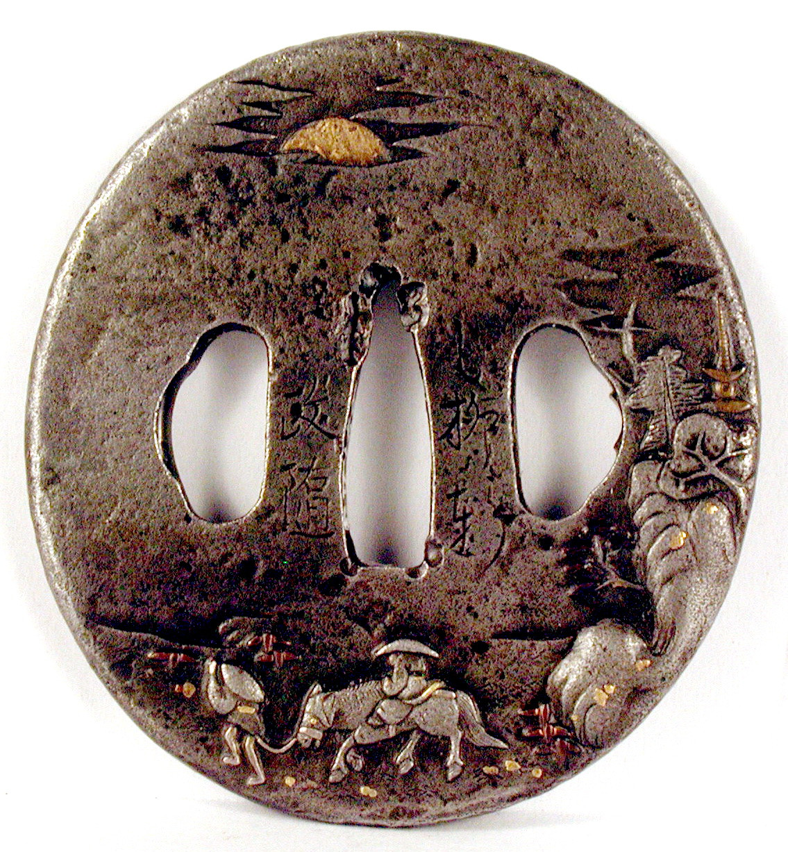 1. Консультація 1961 р. наукового співробітника Державного Ермітажу, канд. іст. наук В.Т. Дашкевич: залізна цуба з рельєфним зображенням сенніна Тоба на коні, якого веде селянин. Інкрустація червоною бронзою, сріблом та золотом. Місяц виконано рельєфом золотою насічкою. Підпис Масаюкі Оцурюкен. Родина Хамано (1696-1769). Перша половина 18 ст. Учень Тосінага І (Нара), засновник родини Хамано.