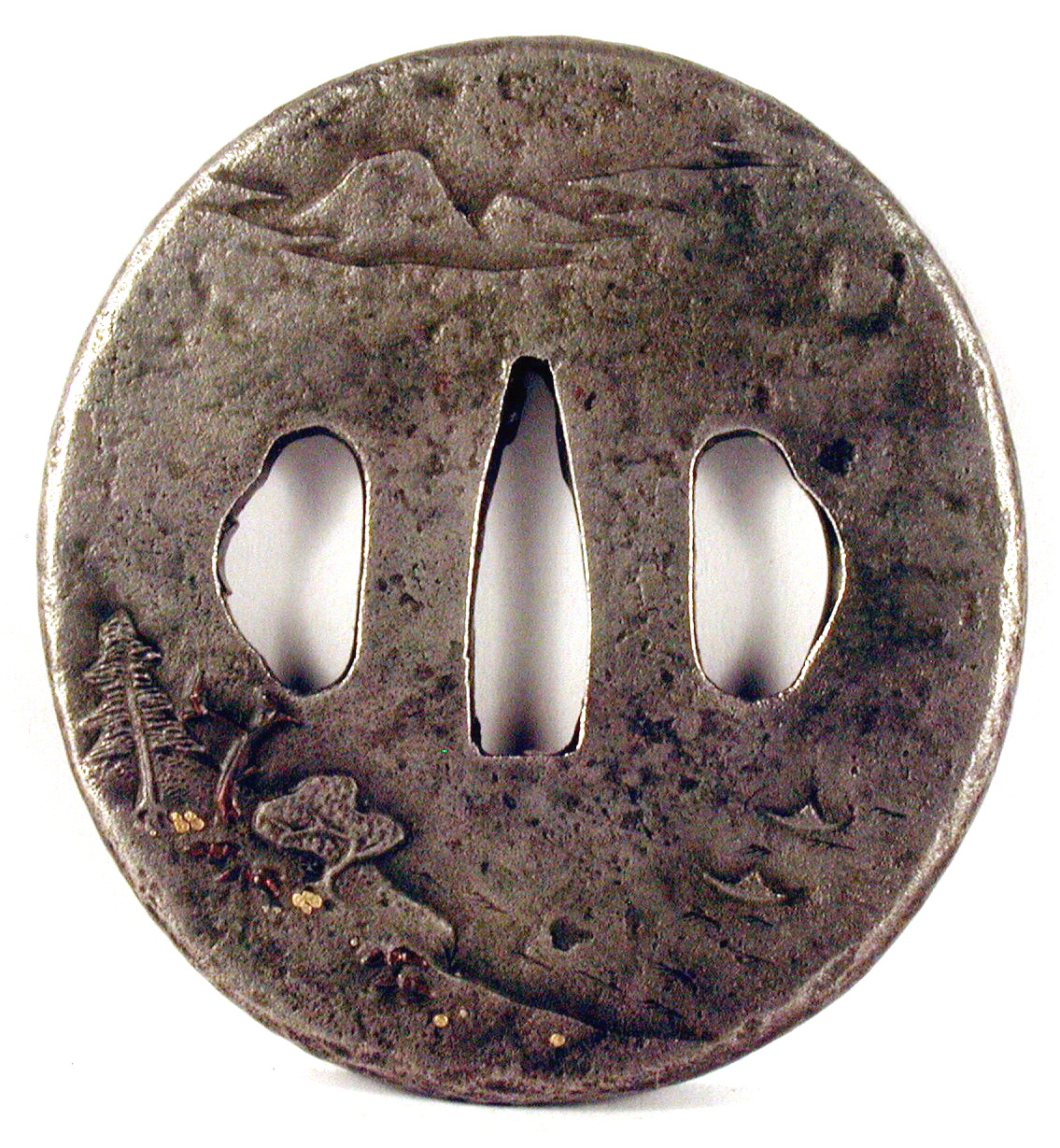 Закладка “Атрибуція” - Наим. предмета, издания: Цуба із зображенням мандрів поета Басьо (1644-1694) і його учня Сора/Змiн. розміри: 6,8 х 7,3 см/Змiн.додаток до назва (лист, ...): Цуба залізна овальної форми (nagamarugata), з трьома отворами rio hitsu. На аверсі внизу зображено чоловіка у крислатому капелюсі верхи на коні, якого веде за вуздечку інший чоловік; праворуч від них – фрагмент пейзажу: скелі, що поросли соснами, зверху над ними - краєчок сонця, вкритого хмарами. На реверсі ліворуч – зображення скель і дерев, вгорі – хмари./Змiн. Написи, клейма, марки: На аверсі ліворуч від отвору наваго-хіну-ана на сеппадай – підпис автора «Masayuki». Праворуч на сеппадай – «Otsuryuken»./Змiн. час створення: Перша половина 18 ст.Автор, автор съемки: Масаюкі Оцурюкенмісце створення, школа: школа ХаманоНовый материал: залізоНовый материал: бронзаНовый материал: дорогоцінні металиНовый материал: сріблоИзм. техника: куванняИзм. техника: гравіруванняИзм. техника: інкрустаціяИзм. техника: золочення