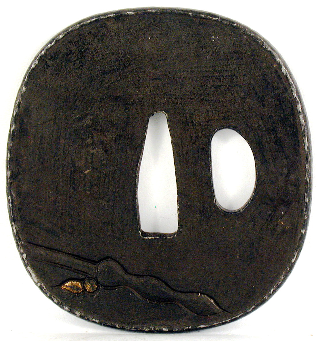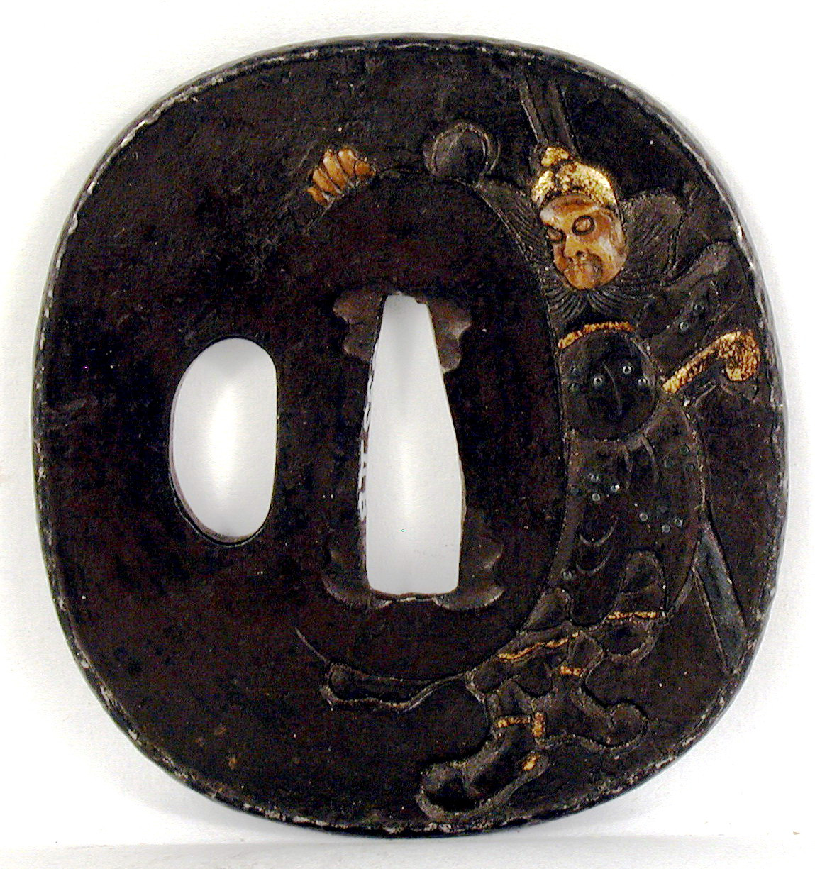 Закладка “Атрибуція” - Наим. предмета, издания: Цуба із зображенням Сьокі, приборкувача чортів/Змiн. розміри: 6,7 х 7,2 х 7,4 смАвтор, автор съемки: Невідомий майстерНовый материал: залізоНовый материал: бронзаИзм. техника: куванняИзм. техника: гравіруванняИзм. техника: накладний рельєфИзм. техника: позолота