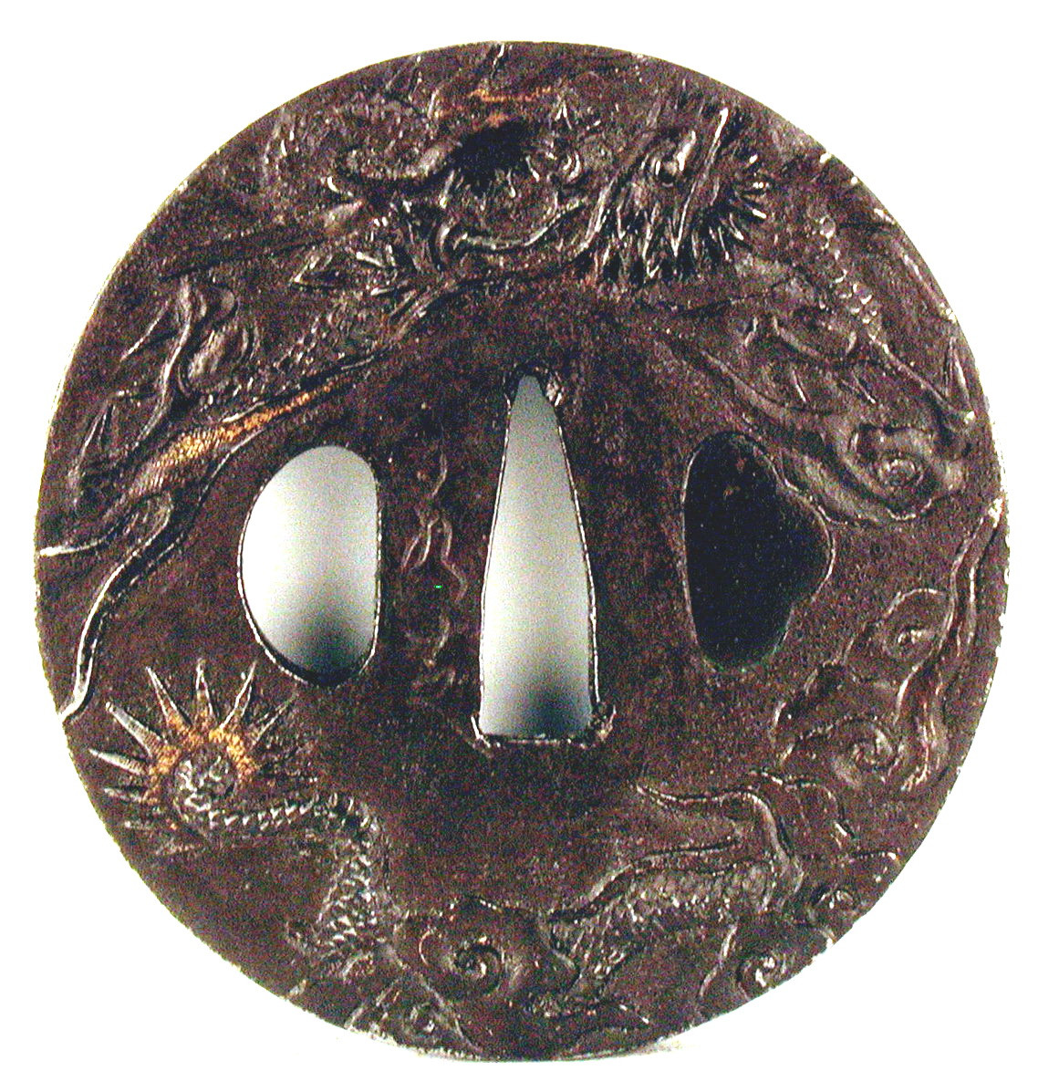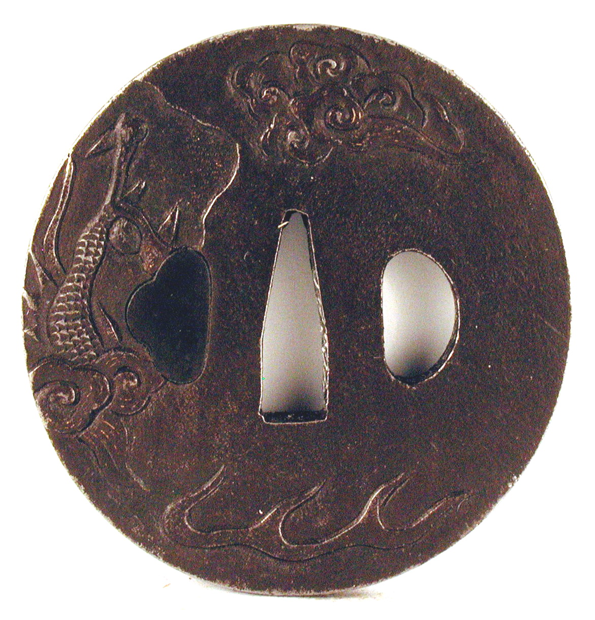 Закладка “Атрибуція” - Наим. предмета, издания: Цуба з зображенням Дракона/Змiн. розміри: 7,2 х 7,6 см/Змiн.додаток до назва (лист, ...): Цуба залізна, овальна форма нага мару гата з трьома отворами ріо хіцу ана, отвір когаі хіцу закрито бронзовою пластинкою. На аверсі зображено Дракона, зображеня частково переходить на реверс./Змiн. Написи, клейма, марки: На аверсі на сеппа-даі ліворуч від накаго ана гравіровано: «Jakushi»./Змiн. час створення: 18 ст.Автор, автор съемки: Дзякуші ІІНовый материал: залізоИзм. техника: куванняИзм. техника: гравіруванняИзм. техника: позолотамісце створення, школа: м. НагасакіНовый материал: дорогоцінні метали