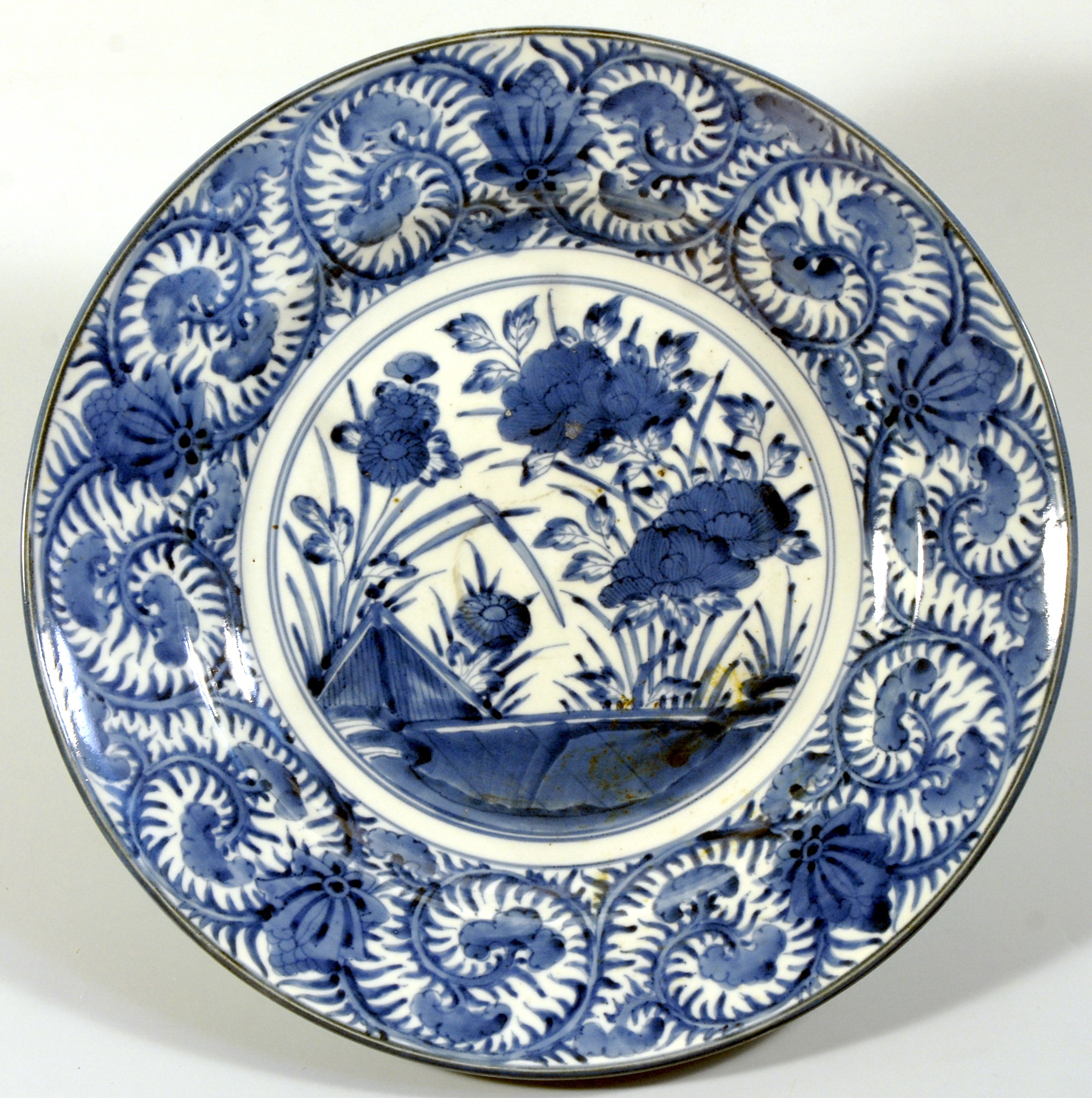 Таріль круглий з широким нахилом борту, в дзеркалі хризантеми та інші квіти.