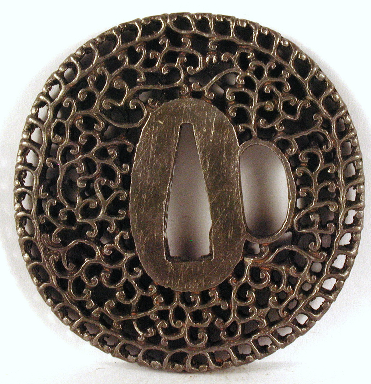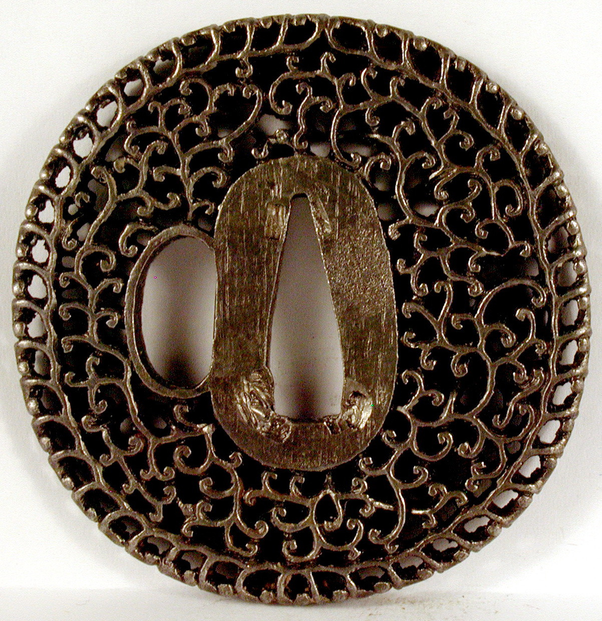 Закладка “Атрибуція” - Наим. предмета, издания: Цуба у стилі "намбан" із ажурним візерунком у вигляді завитків/Змiн. розміри: 6,8 х 7,0 х 7,1 смАвтор, автор съемки: Невідомий майстермісце створення, школа: стиль Намбан
