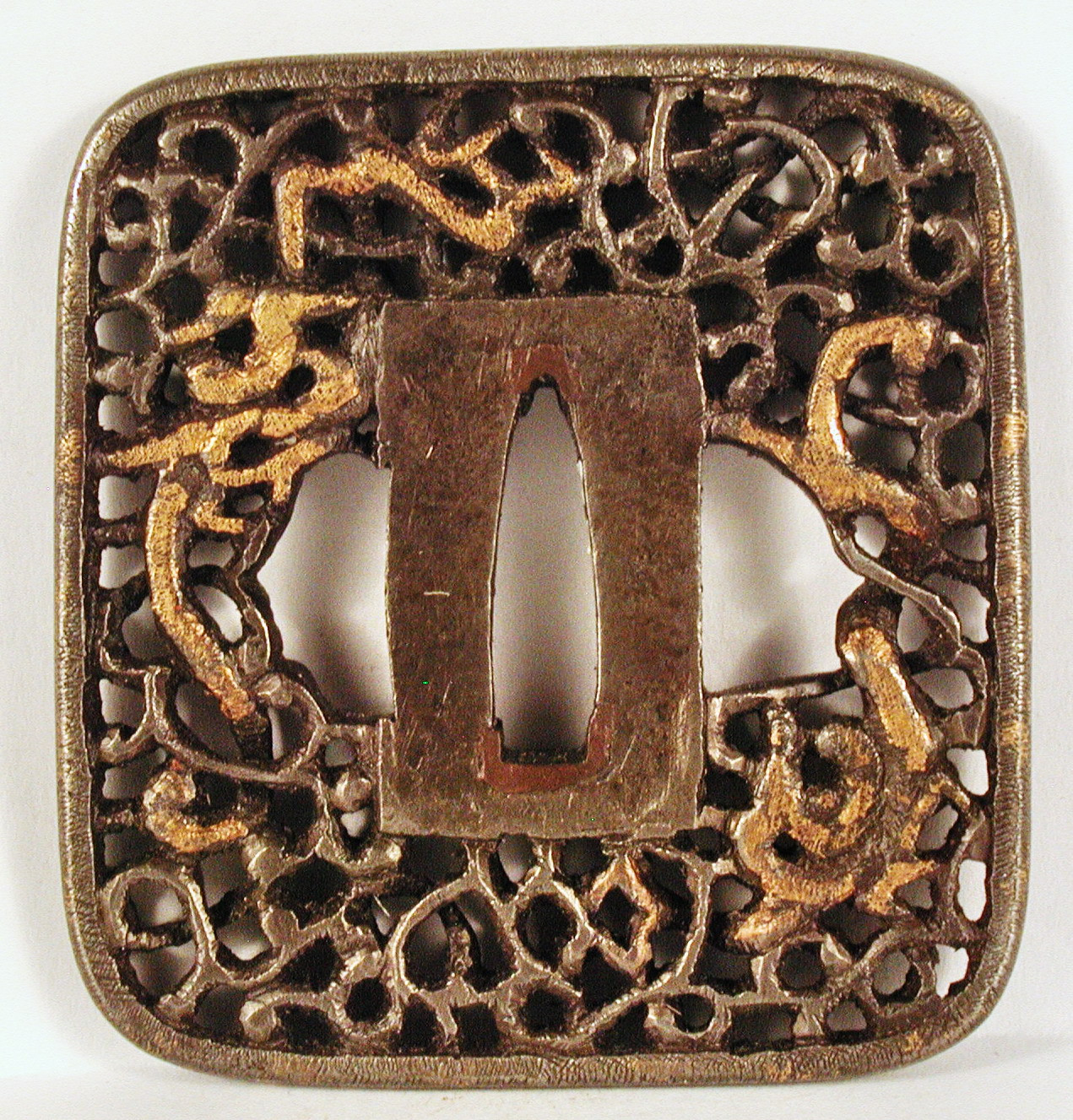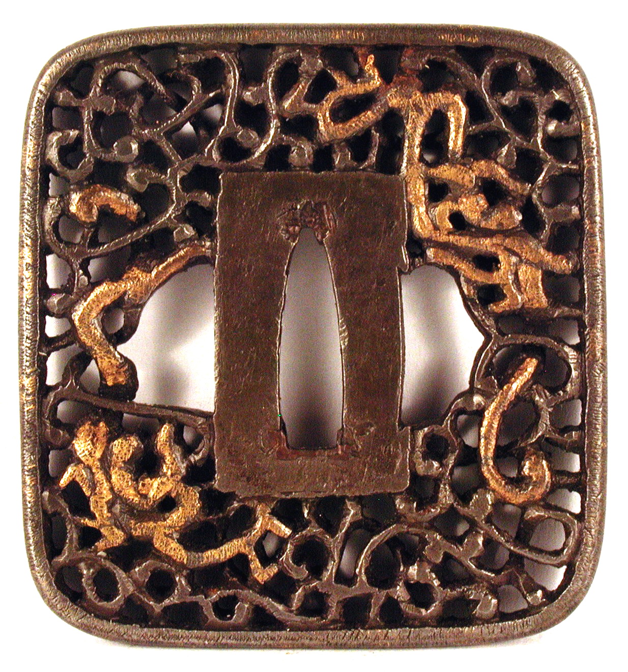 Закладка “Атрибуція” - Наим. предмета, издания: Цуба у стилі "намбан" з ажурним візерунком у вигляді завитків/Змiн. розміри: 6,9 х 7,3 х 8,9 ст/Змiн. час створення: XVII-XVIII ст.Автор, автор съемки: Невідомий майстермісце створення, школа: стиль НамбанИзм. техника: куванняИзм. техника: різьбленняИзм. техника: гравіруванняИзм. техника: насічка золотом