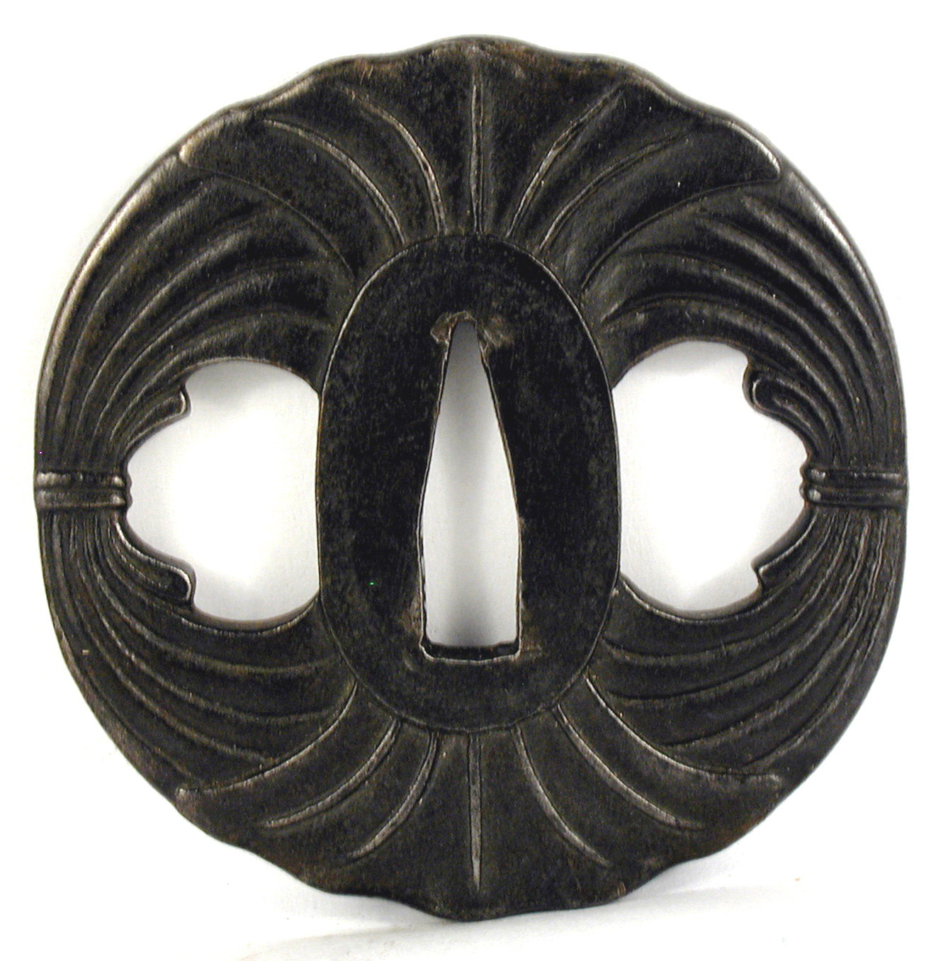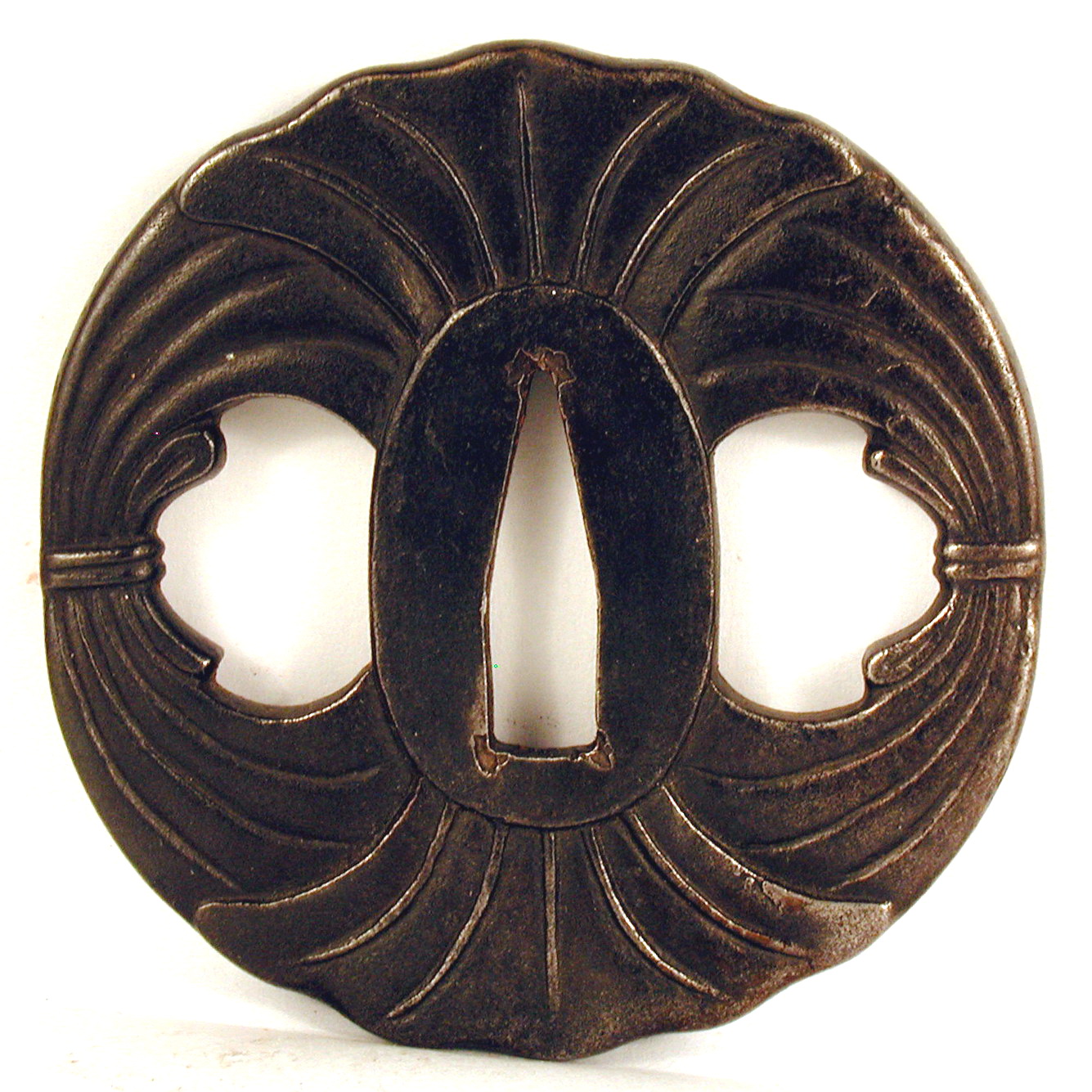 Закладка “Атрибуція” - Наим. предмета, издания: Цуба із зображенням стилізованих в'язанок листя/Змiн. розміри: 7,7 х 7,8 х 7,9 смАвтор, автор съемки: Невідомий майстермісце створення, школа: провінція СацумаИзм. техника: куванняИзм. техника: гравірування
