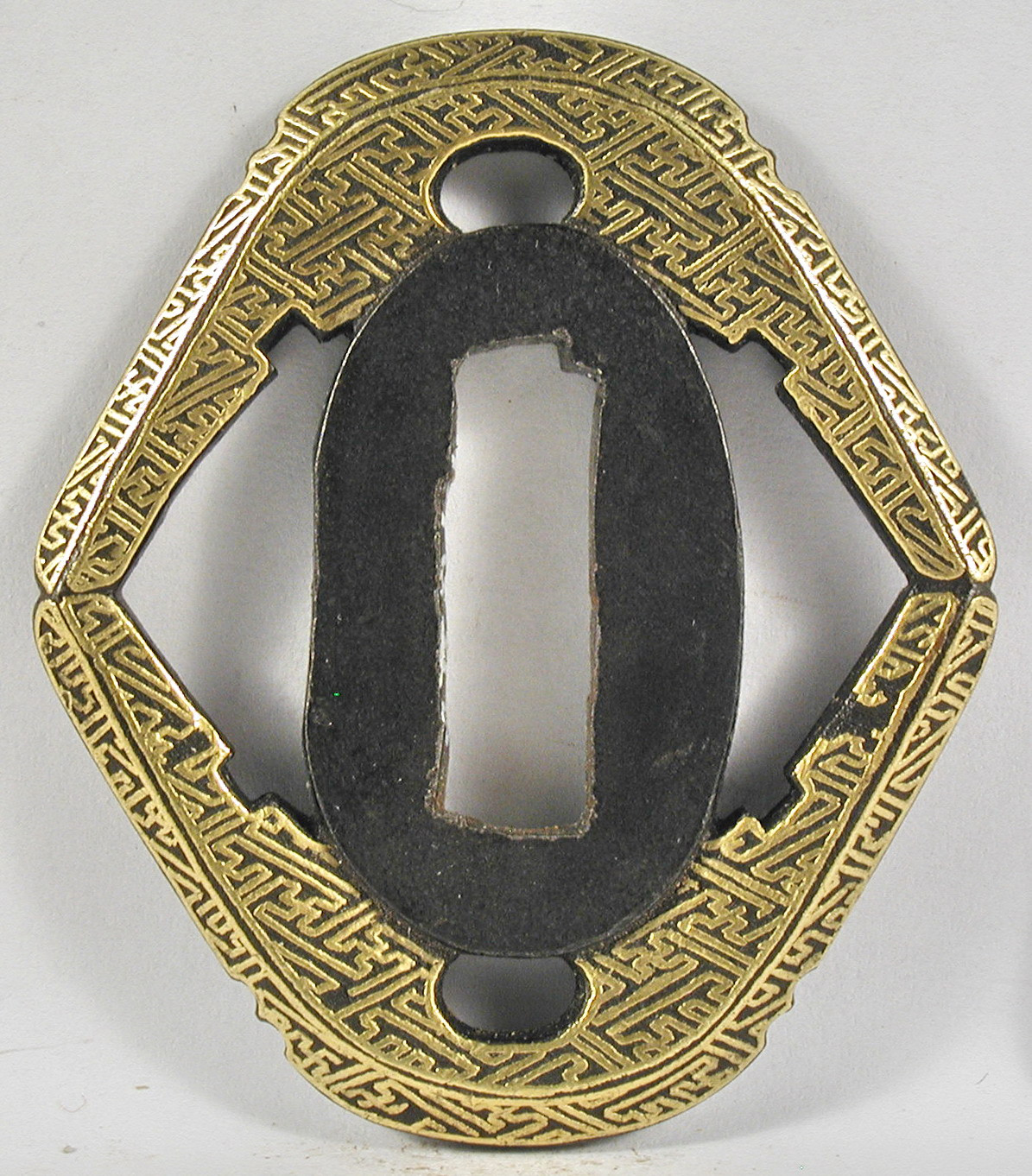 Закладка “Атрибуція” - Наим. предмета, издания: Цуба із зображенням геометричного орнаменту лей, або мандзі - свастики/Змiн. розміри: 5,4 х 6,3 см/Змiн.додаток до назва (лист, ...): Цуба залізна ромбоподібної форми, має три отвори ріо хіцу неправильної форми: накаго – прямокутний, когаї і кодзука – трикутні з фігурним контуром. В позитивному силуеті утворюється зображення двох сідел, з’єднаних краями. Зверху і знизу біля накаго-ана – невеликі овальні отвори. Декор з обох сторін – геометричний, з використанням зображення свастики («вань») бронзовим позолоченим дротом у техніці хіродзоган./Змiн. час створення: 17 ст.Автор, автор съемки: Майстер школи Сьоамімісце створення, школа: ЯпоніяНовый материал: залізоИзм. техника: куванняИзм. техника: різьбленняИзм. техника: інкрустація бронзоюНовый материал: бронзаНовый материал: дорогоцінні метали