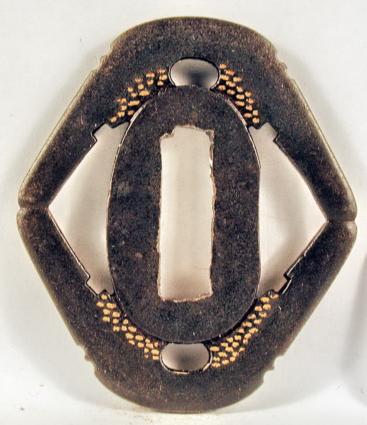 Комм.: Зображення свастики (яп. «мандзі», кит. «вань»)тлумачні словними японської і китайської мови подають у значенні буддійського символа «серце Будди»./Аналогіi: За технікою і характером декору близька до музейної цуба № 450 ДВ/Історія Атрибуціi: Консультація 1961 р. наукового співробітника Державного Ермітажу, канд. іст. наук В.Т. Дашкевич: можливо Сьоамі, 17-18 ст./Кількість: 1
