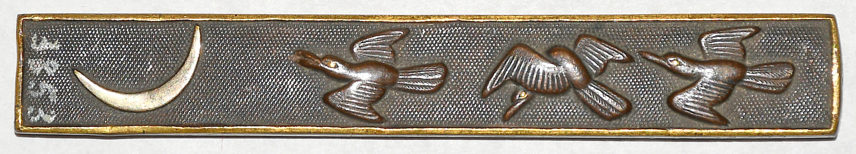 Закладка “Атрибуція” - Наим. предмета, издания: Кодзука із гусями та місяцем/Змiн. розміри: 9,6 х 1,4 см/Змiн. час створення: XIX ст.Новый материал: бронзаНовый материал: латунь