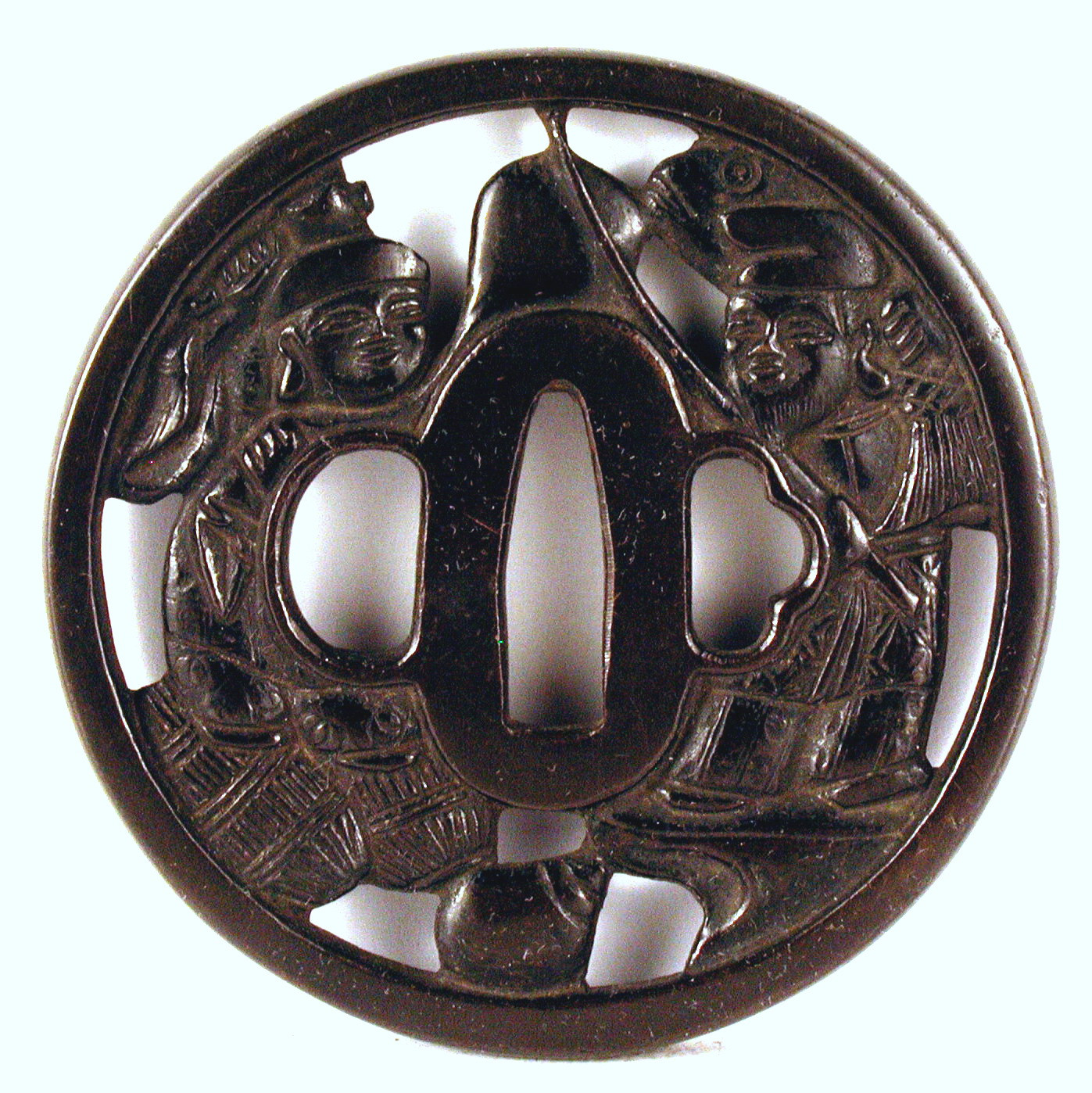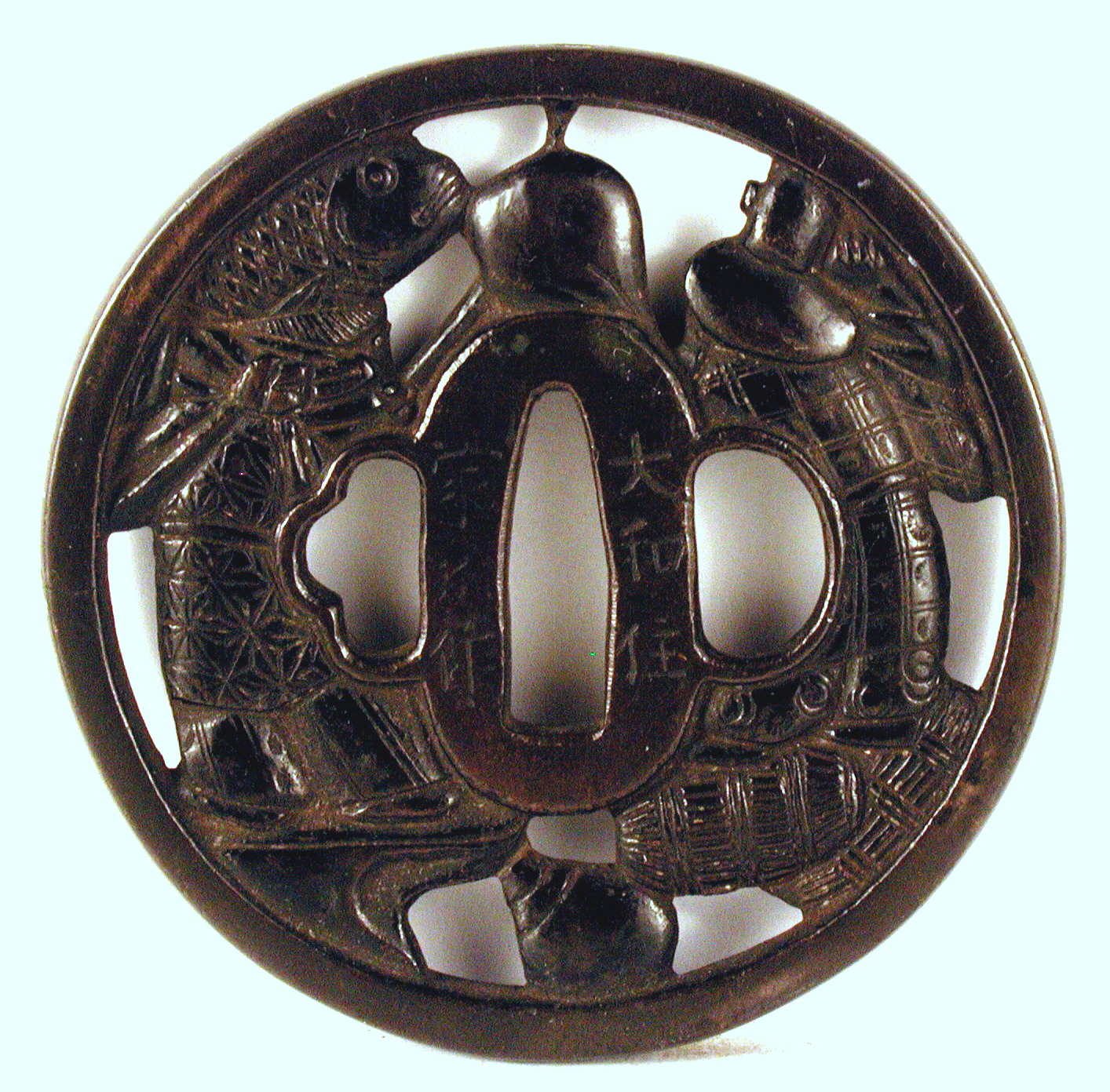 Історія Атрибуціi: 1961, Ермітаж, Дашкевич В.Т.: бог щастя Ебісу з вудкою, карпом та хлопчиком. Підпис: Іецугу зробив, мешкає у провінції Ямато, родина Міномото в м. Кіото - майстер по мечах, перша половина 17 ст./Кількість: 1/Опис: Цуба бронзова, патинована, кругла з широким пласким ободом. Перфорована. У позитивному силуеті модельоіване з обох боків зображення богів щастя